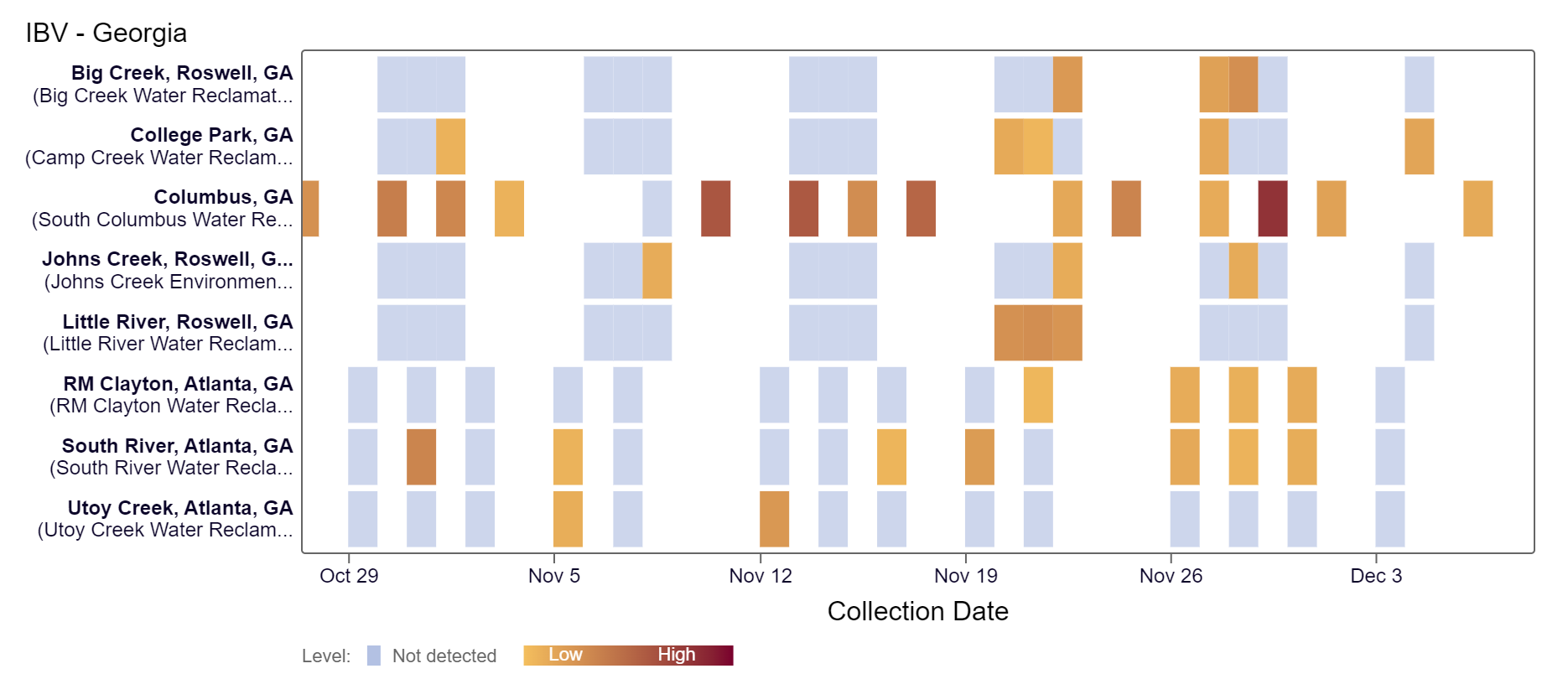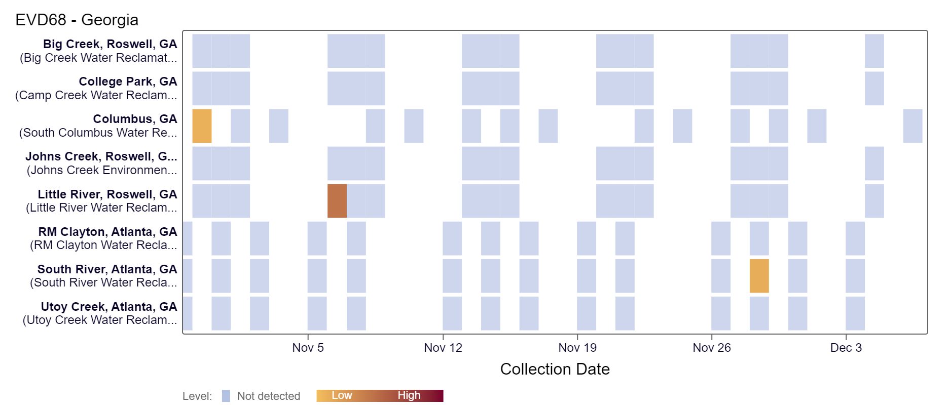 EV-D68 RNA is rarely detected at Georgia sites. There was a single detection at South River in the last two weeks, based on the heat map below. As a reminder, the color blue means the sample was non-detect for EV-D68 RNA and the colors get darker with higher concentrations. Because this is a new target, there is no category assigned and we are still establishing what an expected baseline amount of detection will be.