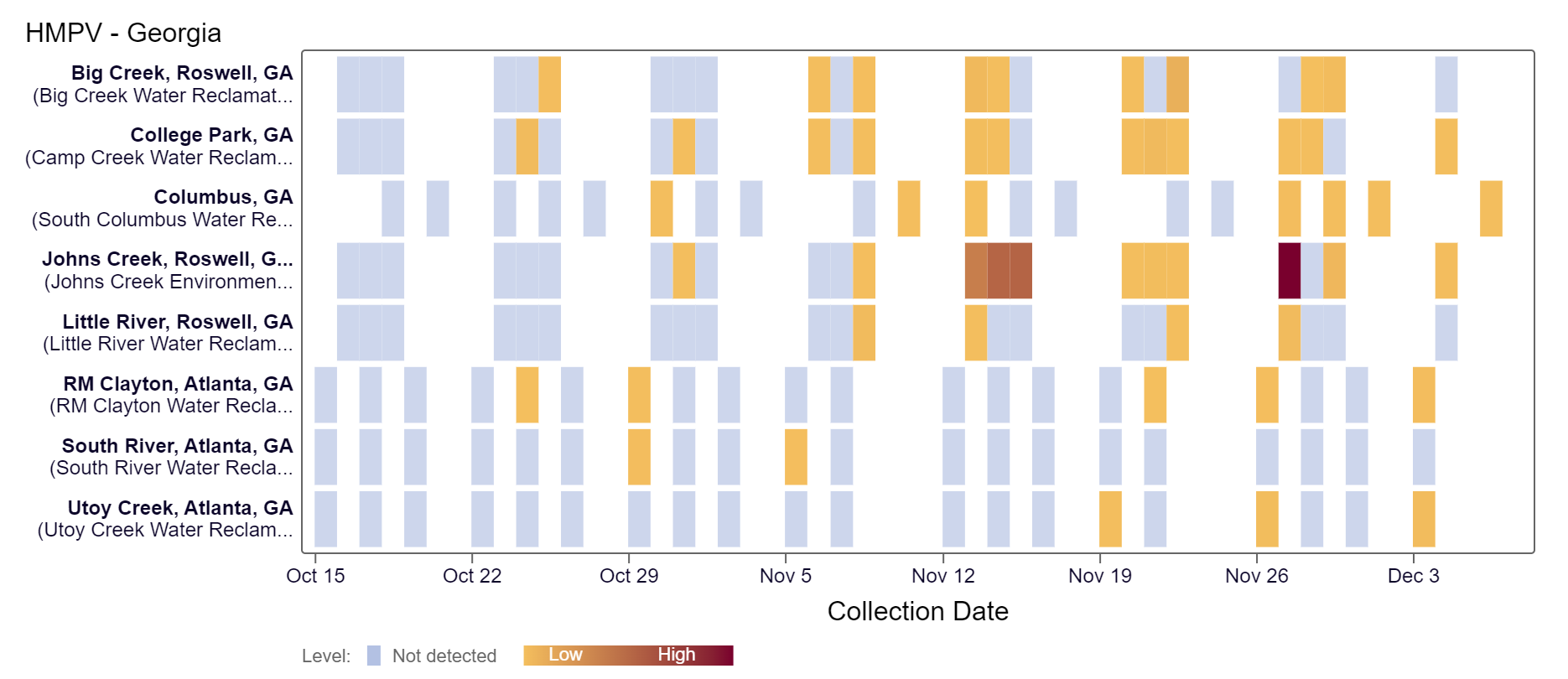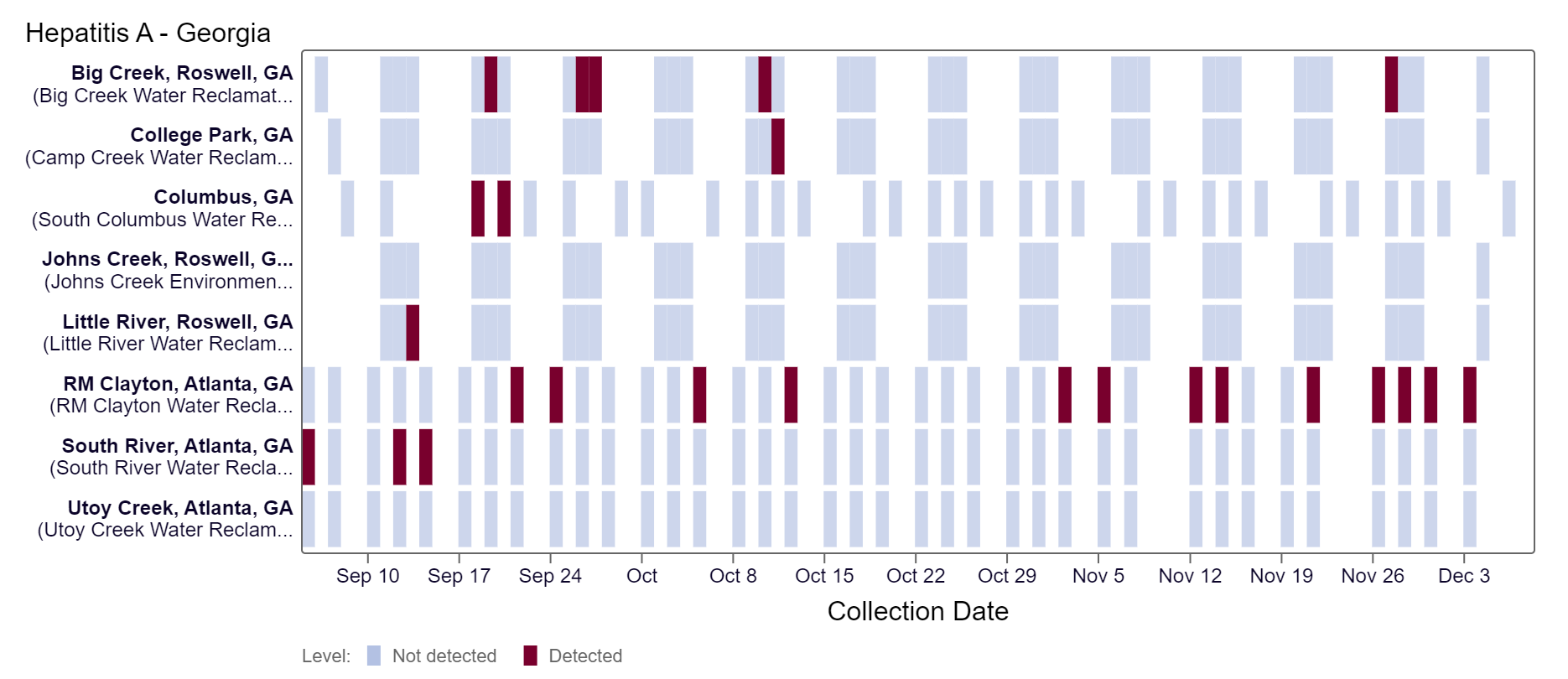Hepatitis A RNA detection is sporadic and has only been detected at RM Clayton and Big Creek over the last two weeks. Because this is a new target, there is no category assigned and we are still establishing what an expected baseline amount of detection will be.