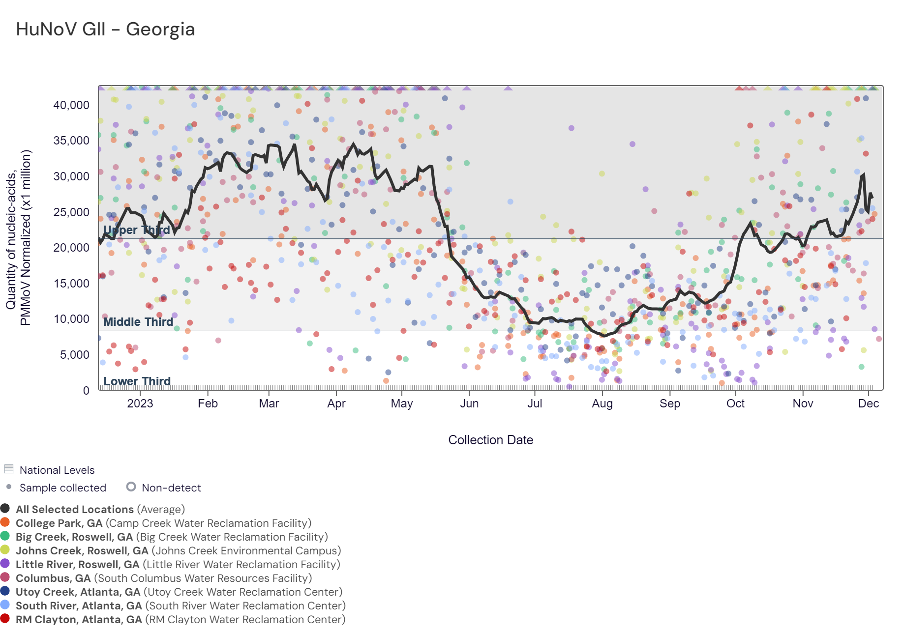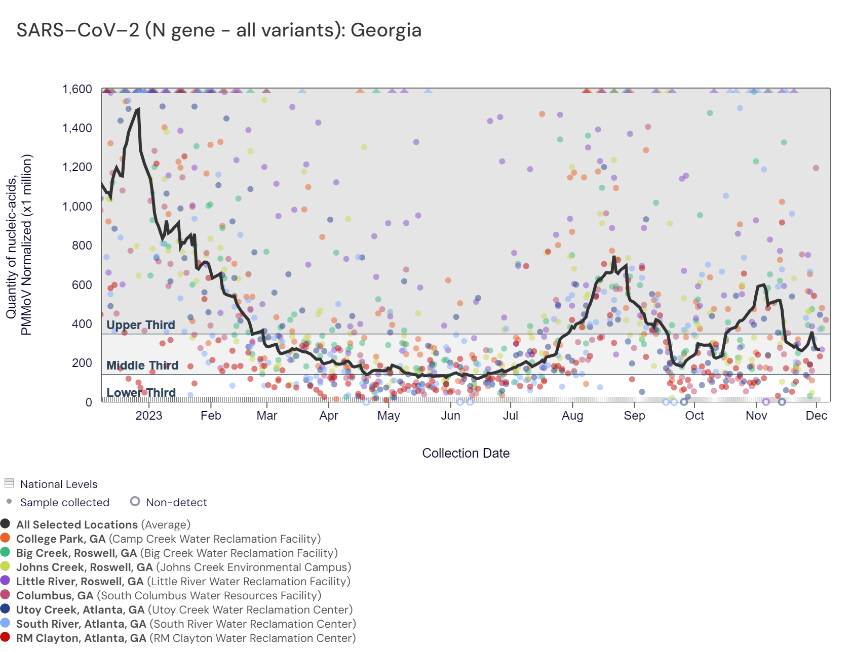 SARS-CoV-2 RNA concentrations have between 25,400 and 146,000 copies/gram in the last two weeks. The chart below shows the raw data since December 2022 and the population-weighted aggregated trend line for all 8 Georgia sites when the data is normalized by PMMoV. The aggregated line and the National Levels benchmarks illustrate that SARS-CoV-2 N gene RNA concentrations among Georgia sites are within the middle third level of all concentrations measured in the last year.