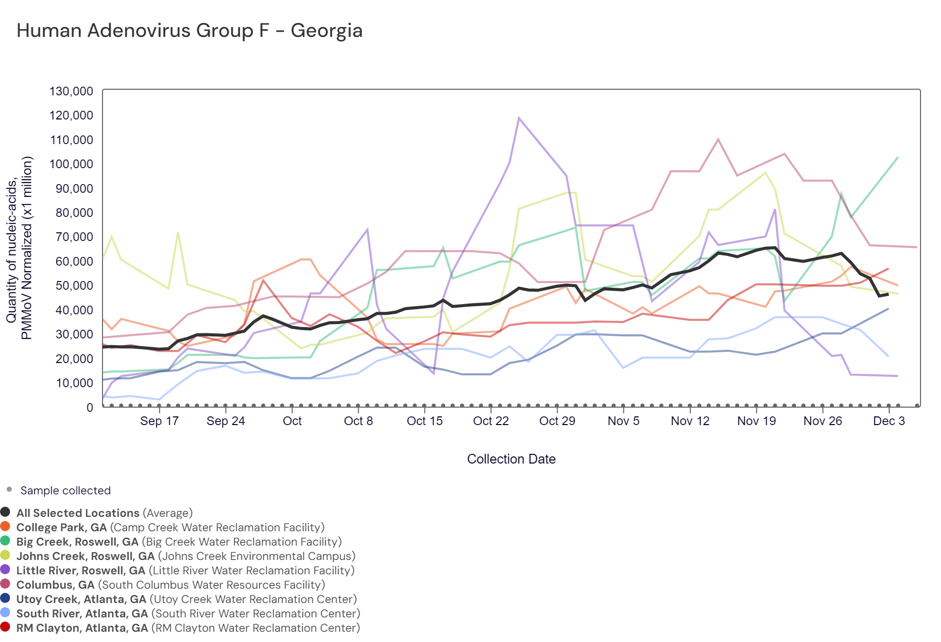 Norovirus GII (HuNoV GII) RNA concentrations range between 2,300,000 - 14,000,000 copies/g and the population-weighted average line for the 8 Georgia sites is within the upper third level.