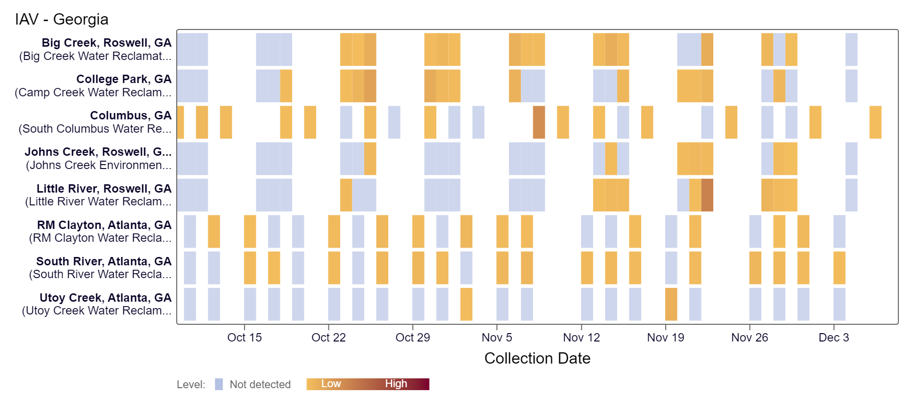 Influenza A (IAV) RNA concentrations are less than 8,100 copies/gram. IAV has been detected at at all Georgia sites within the last few weeks as seen in the heat map below. As of 12/8/2023, there are 7 sites in the LOW Wastewater Category and South River is in the HIGH (1 site) Wastewater Category. Both Big Creek and South River have had recent onsets of influenza A in wastewater.