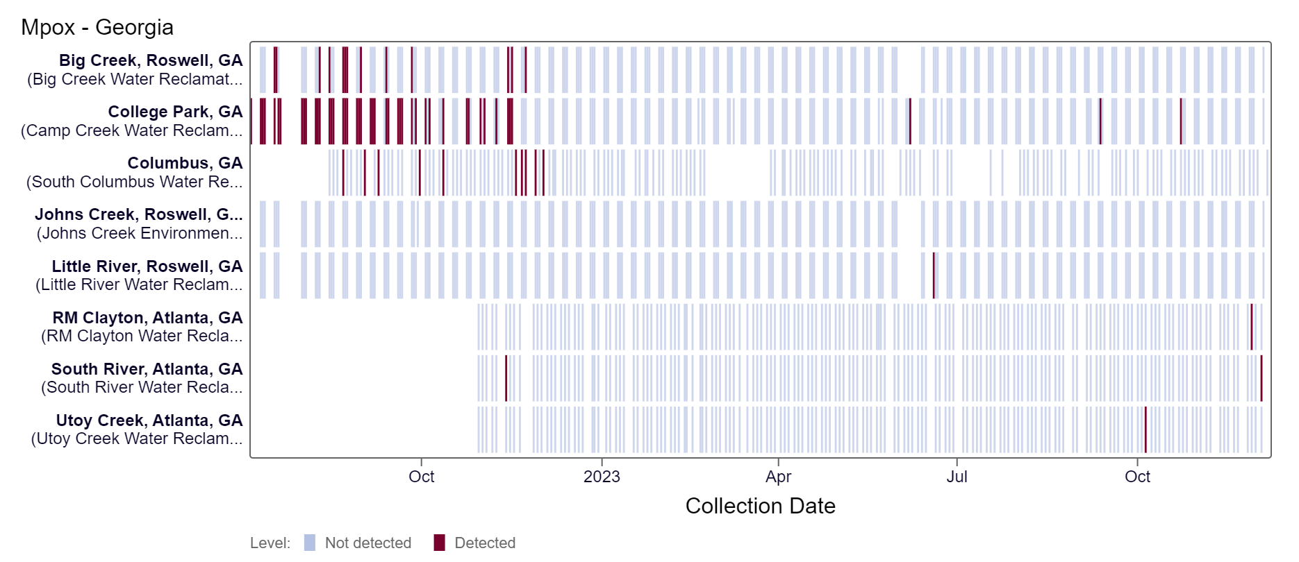 Mpox DNA results have been non-detect at most sites in the last 21 days except at RM Clayton and South River, where there were detections on 11/28/23 and 12/3/23. This heat map shows data since July 2022. Sites are labeled in the rows and each date a sample was collected as a column. The color blue means the sample was non-detect for mpox DNA and the color maroon means Mpox DNA was detected. White indicates no sample was collected. All 8 Georgia sites are in the LOW Wastewater Category as of 12/8/23.