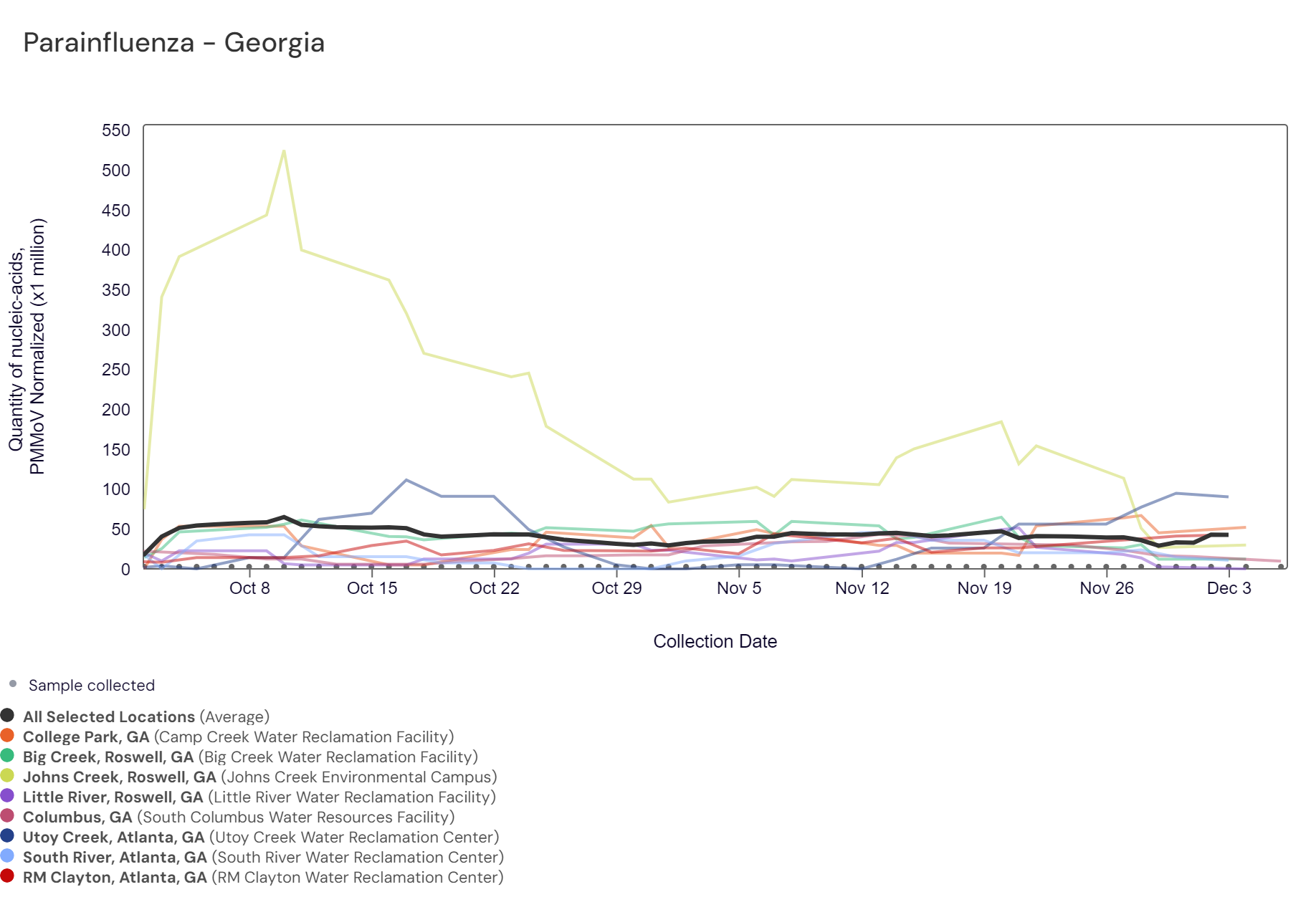 Parainfluenza RNA has been frequently detected in samples collected from most Georgia sites. Concentrations are less than 40,000 copies/g. The chart below shows the raw data since October 2023 and the population-weighted aggregated trend line for all 8 Georgia sites when the data is normalized by PMMoV. Because this is a new target, there is no category assigned and we are still establishing what an expected baseline amount of detection will be.