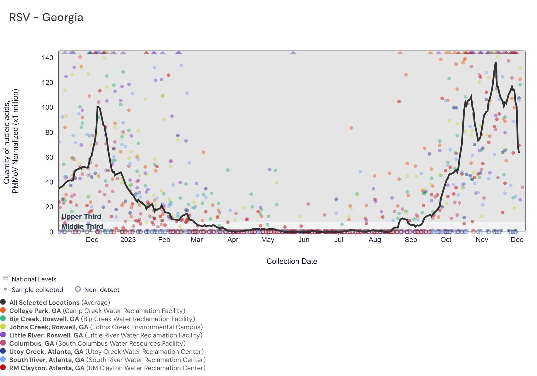 Respiratory syncytial virus (RSV) RNA concentrations were less than 70,000 copies/gram over the last two weeks. The chart below includes the raw data for each site since November 2022. The aggregated line and the National Levels benchmarks illustrate that RSV RNA concentrations among Georgia sites are within the upper third level of all concentrations measured in the last year. Most Georgia sites are in the HIGH (7 sites) Wastewater Category (in onset) as of 12/8/23; Utoy Creek is in the LOW (1 site) category. Recent aggregated levels are similar to last year's peak in RSV but concentrations are slightly higher.