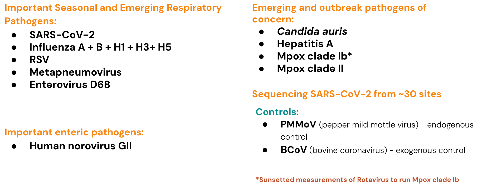 Currently monitoring a suite of Respiratory, Gastrointestinal and Outbreak Pathogens of Concern