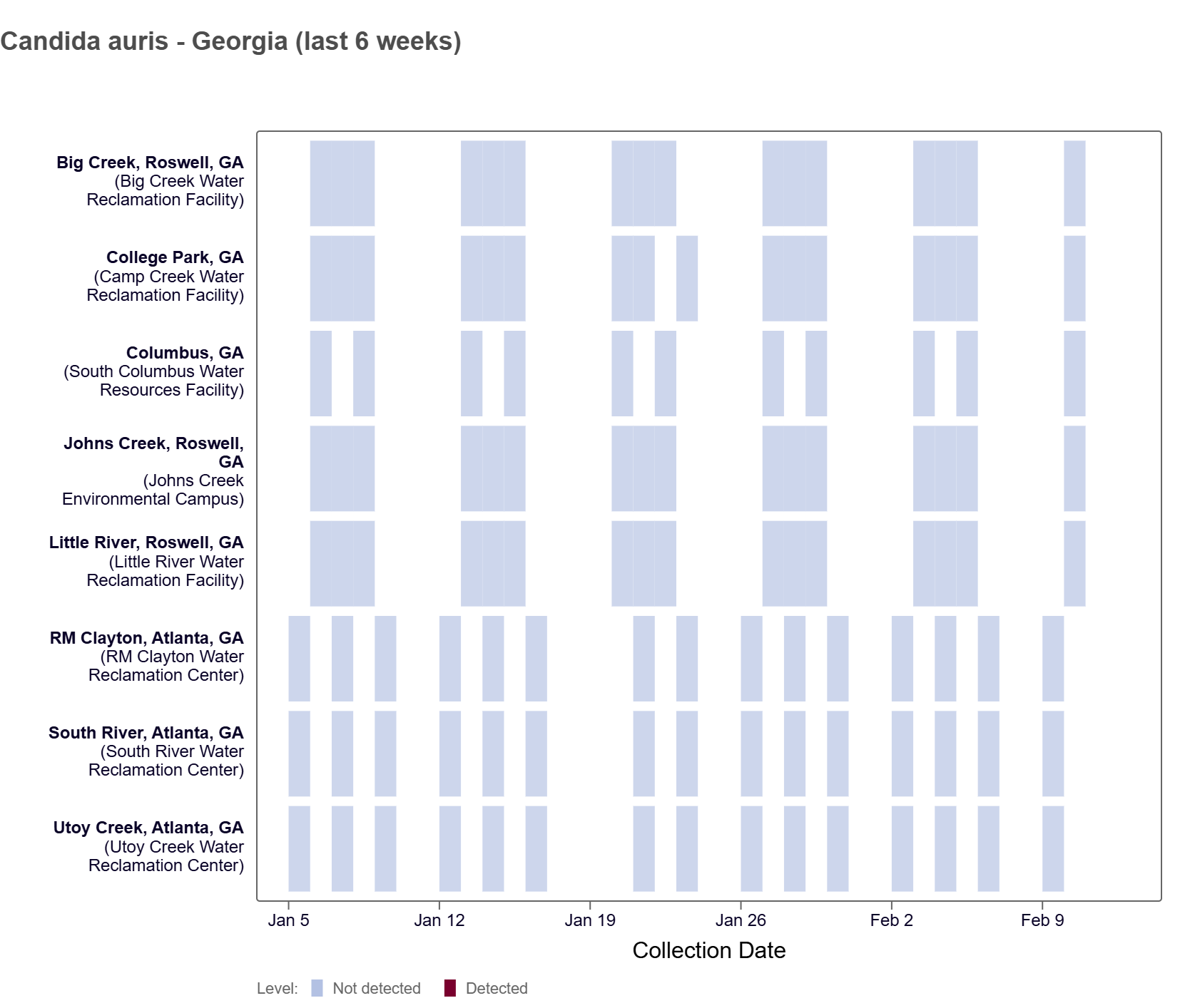 Candida auris DNA has not been detected at a Georgia WWSCAN site in the last two weeks, based on the heat map below.