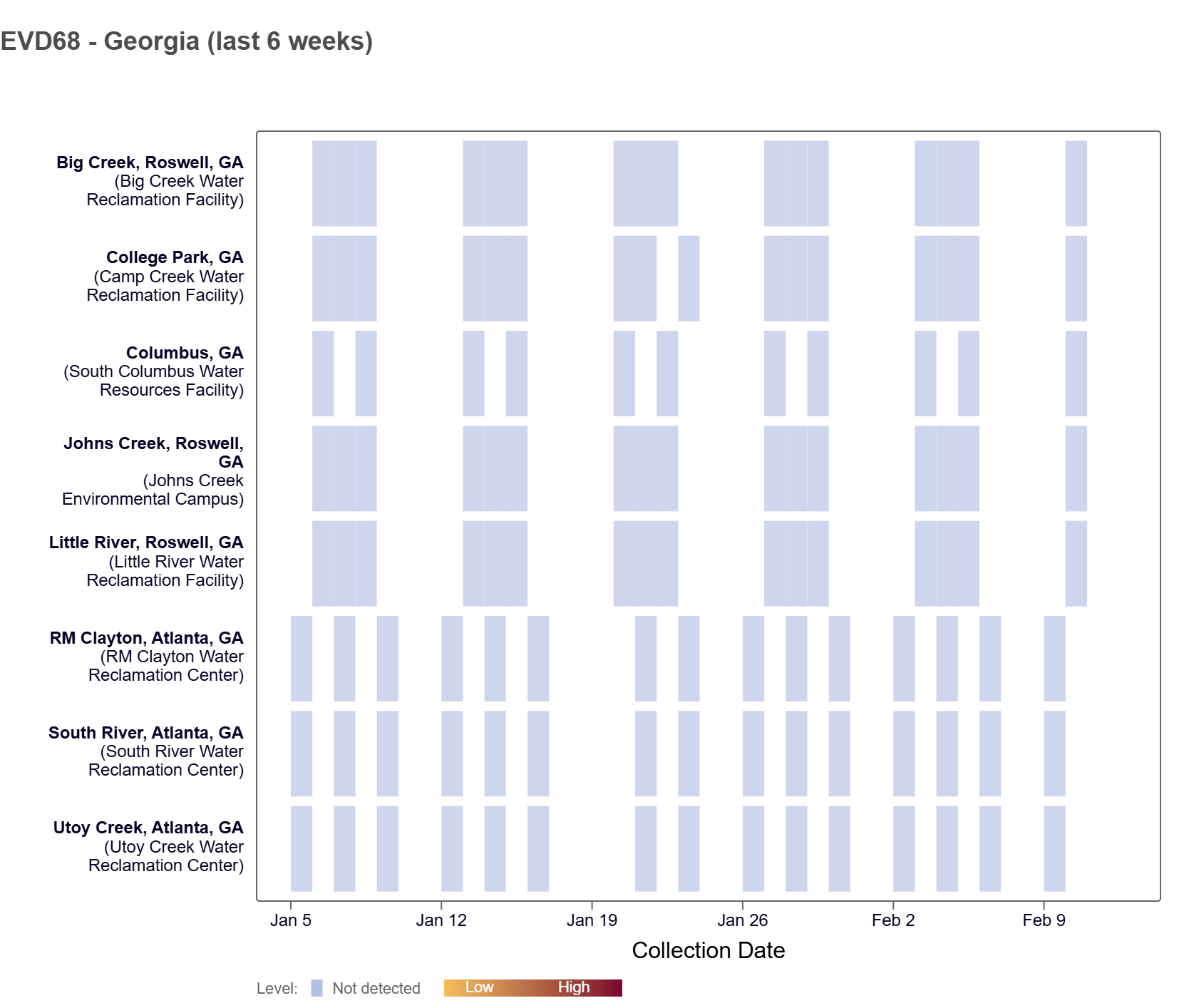 EV-D68 RNA has not been detected at Georgia WWSCAN sites in the last two weeks. In the heat map below, the color blue means the sample was non-detect for EV-D68 RNA.