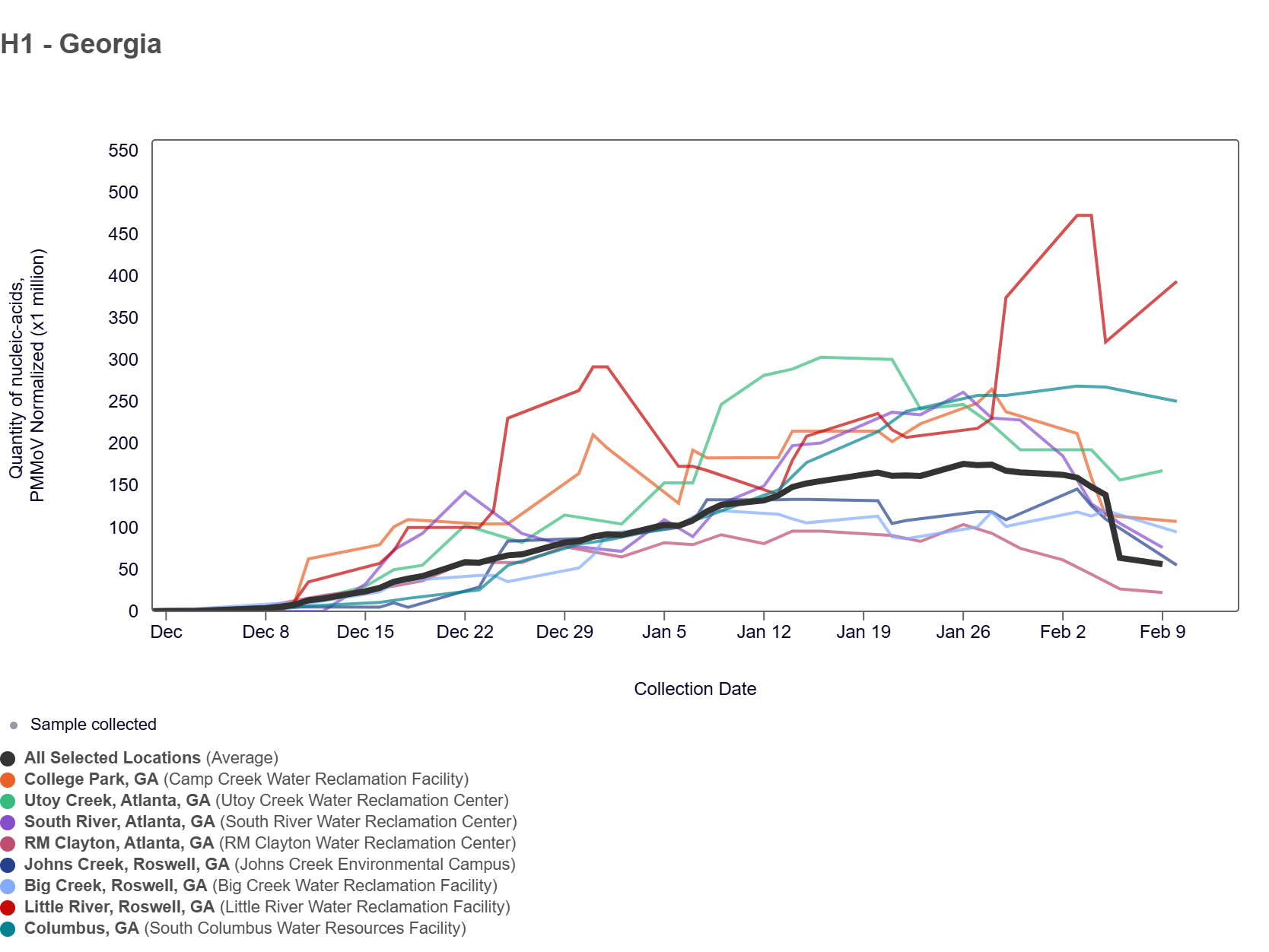 H1 Marker in Influenza A (IAV) has been detected at all 8 Georgia WWSCAN sites in the last two weeks. Concentrations are between 20,000 and 118,000 copies/g. Below is a chart showing trendlines calculated using a 5-day trimmed average for each site and a population-weighted aggregated trend line since monitoring for the H1 marker in influenza resumed in December 2024.
