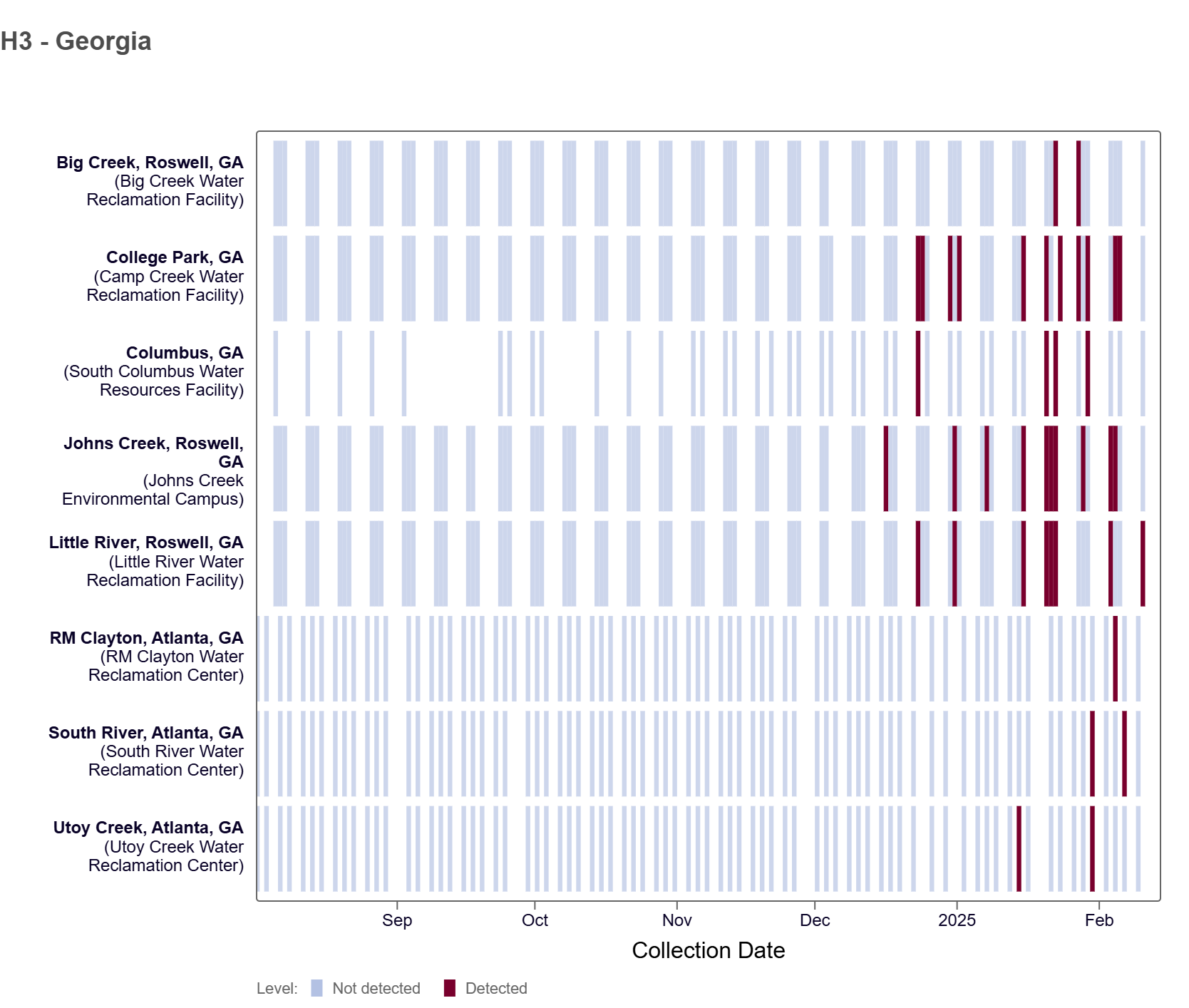 H3 Marker in Influenza A (IAV) has been detected at all 8 Georgia WWSCAN sites since we began testing for the marker prospectively in mid-July 2024, according to the heat map below. Concentrations are below 6,000 copies per gram.
