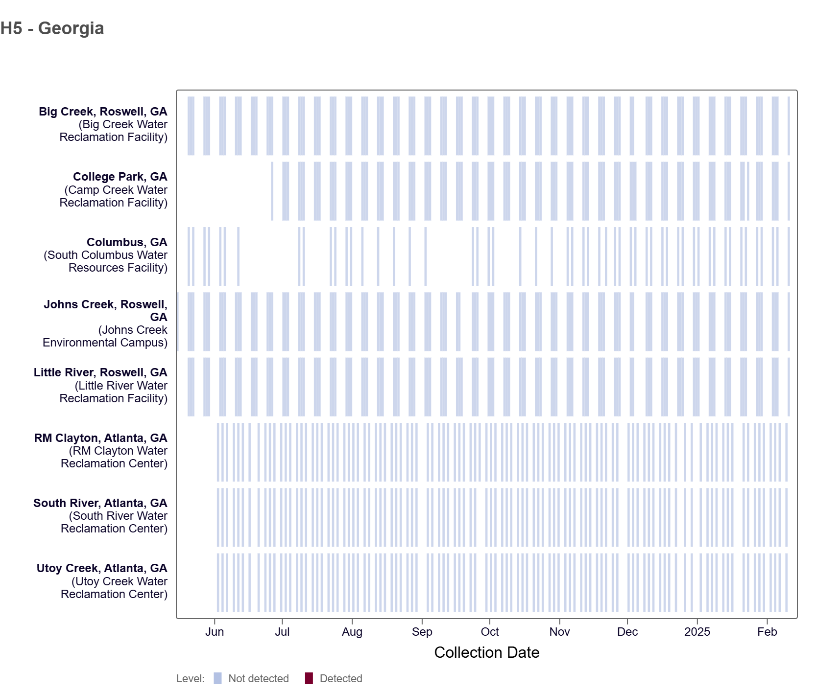 H5 marker in Influenza A (IAV) Below is a heat map showing the Georgia sites with samples collected since we began testing for the marker prospectively in May 2024. For more information about this testing and interpretation of results, see our FAQ sheet here.