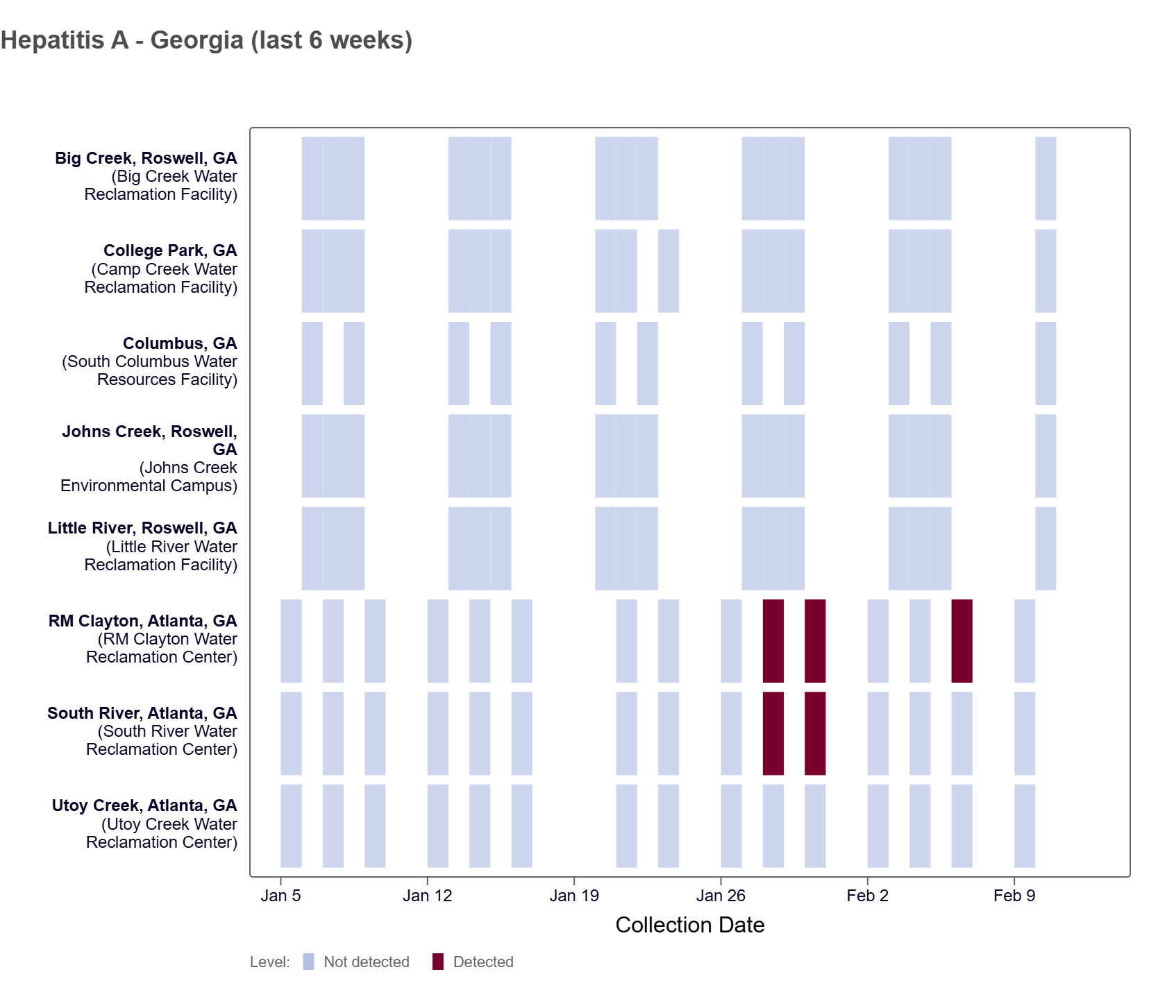 Hepatitis A RNA has been detected in the last two weeks, according to the heat map. Specifically, it has been detected at the RM Clayton and South River sites.