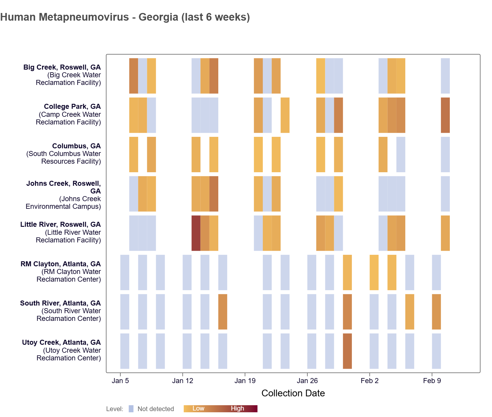 HMPV (human metapneumovirus) RNA has been detected at many of the Georgia WWSCAN sites in the last two weeks (except RM Clayton, and Utoy Creek), based on the heat map below. Concentrations are between ND (non-detect) - 24,000 copies/g.