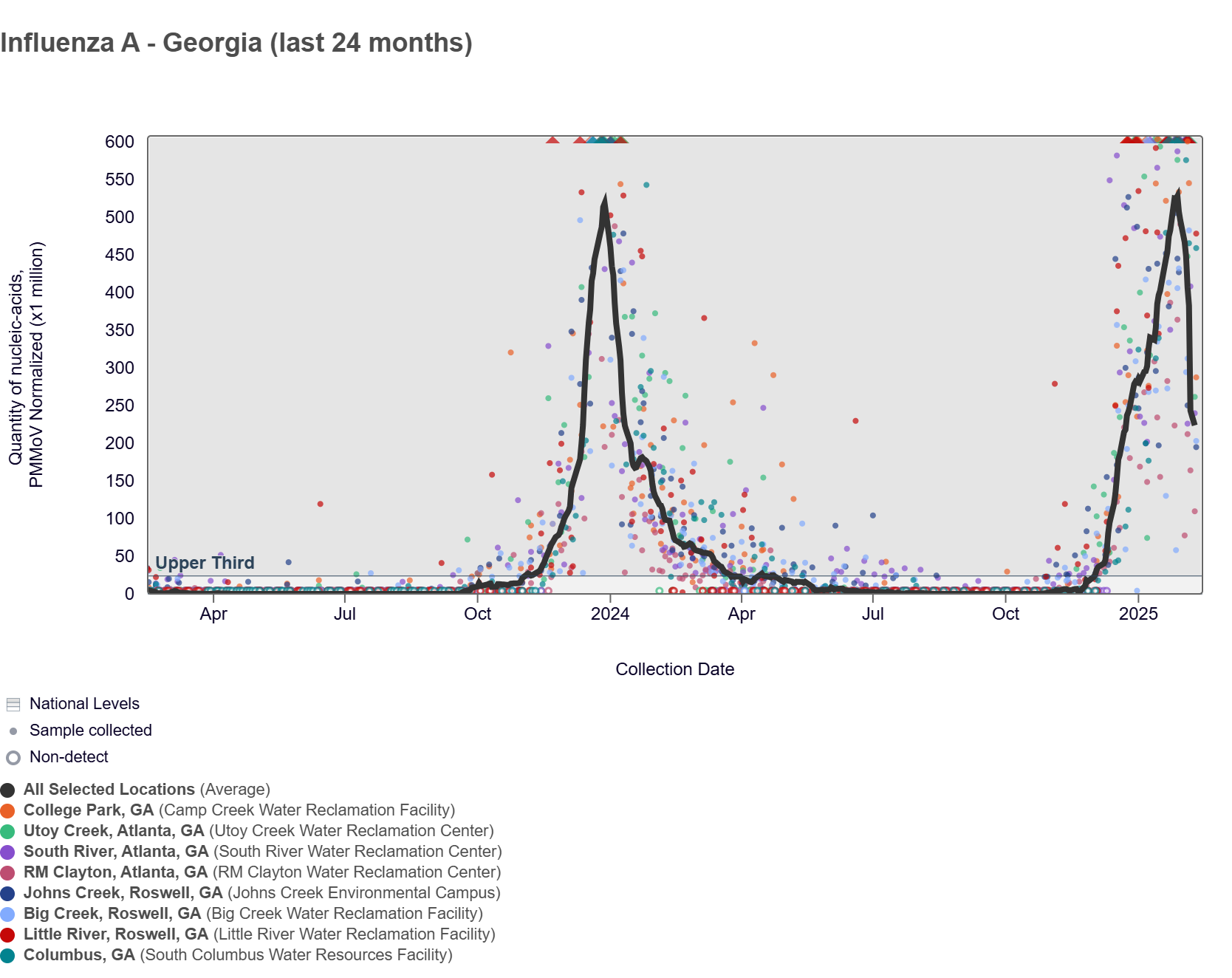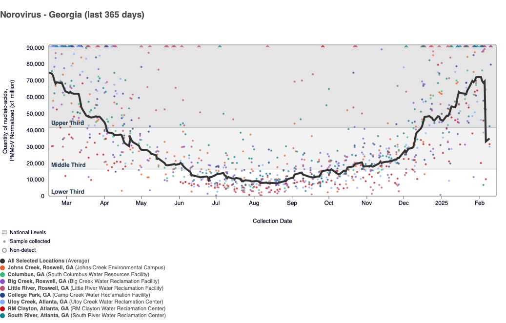 SARS-CoV-2 RNA concentrations have been between 47,000 and 500,000 copies/gram in the last two weeks. The chart below shows the raw data over the last 365 days and the population-weighted aggregated trend line for all 8 Georgia sites when the data is normalized by PMMoV. The aggregated line and the National Levels benchmarks illustrate that SARS-CoV-2 N gene RNA concentrations among Georgia sites are in the middle third level of all concentrations measured in the last year. Levels at the Georgia WWSCAN sites are lower than concentrations seen in January 2024.