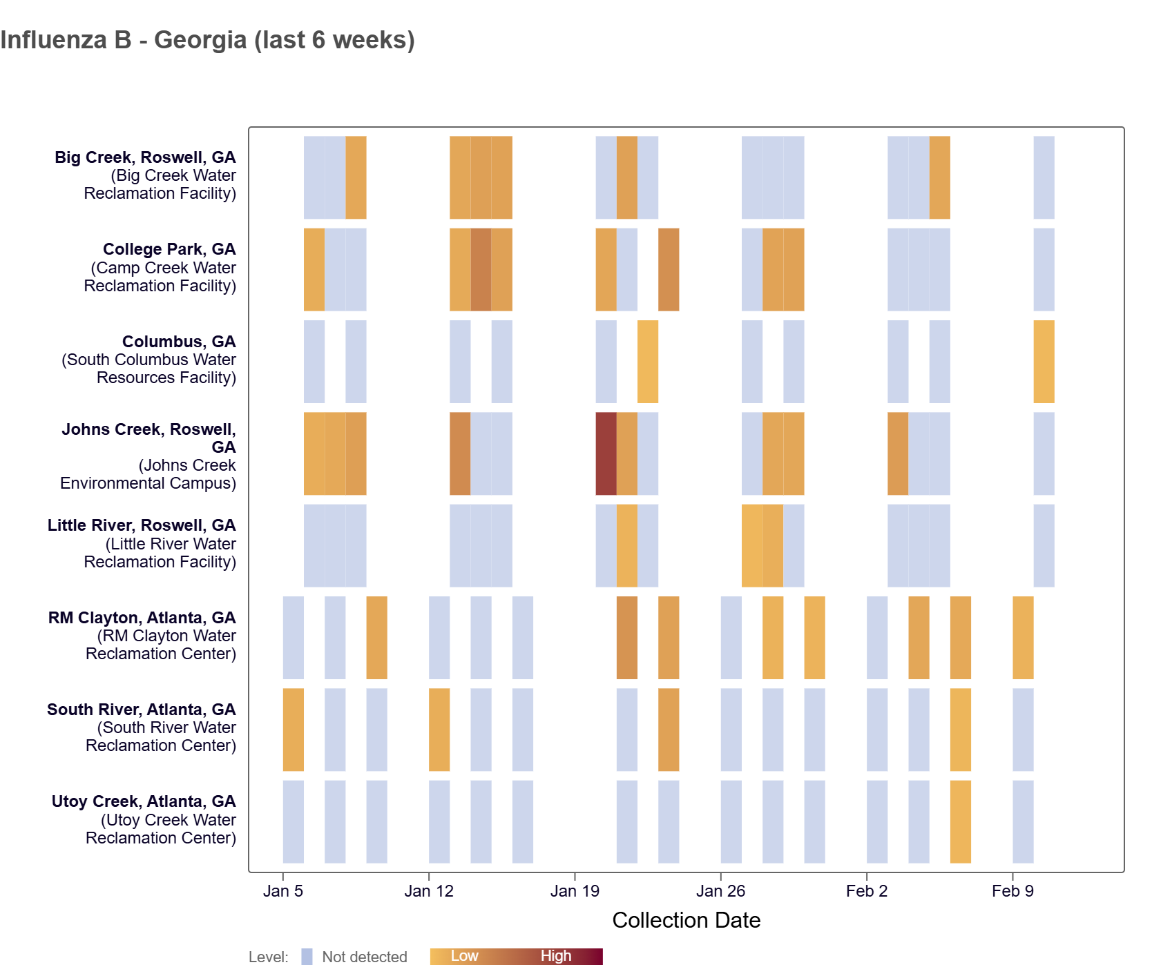Influenza B (IBV) RNA has sporadically been detected at many of the Georgia WWSCAN sites in the last 2 weeks, according to the heat map below.