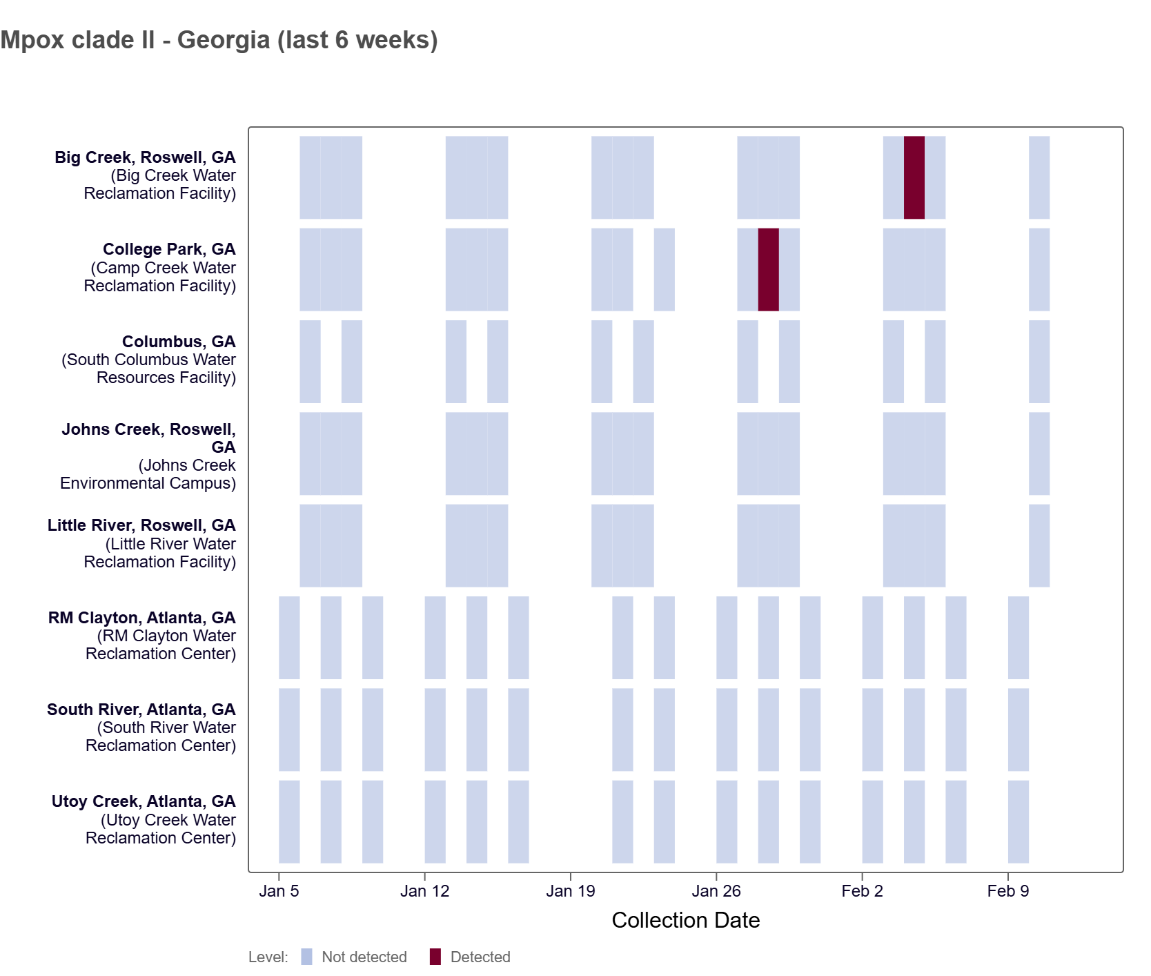 Mpox clade II DNA has been detected at a Georgia WWSCAN site in the last two weeks, based on the heat map below. Specifically, it has been detected in the Big Creek site. Mpox clade II DNA was also detected at the College Park site on January 28th.