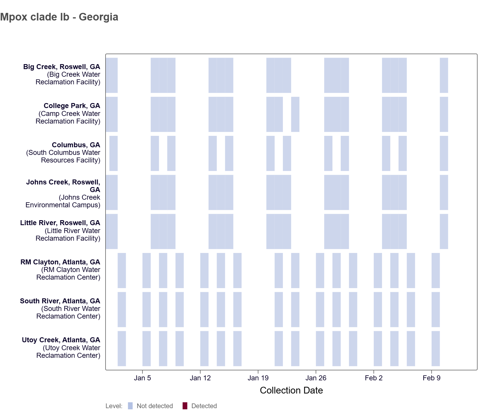 Sites are labeled in the rows and each date a sample was collected as a column. The color blue means the sample was non-detect for mpox DNA and the color maroon means mpox DNA was detected. White indicates no sample was collected.