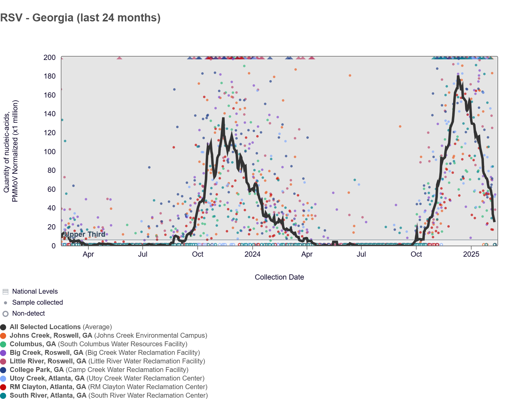 Respiratory syncytial virus (RSV) RNA has frequently been detected across Georgia WWSCAN sites over the past couple of weeks with RSV RNA concentrations between 6,000 and 56,000 copies/g. The chart below shows the raw data, and the population-weighted aggregated trend line for all 8 Georgia sites when the data is normalized by PMMoV is in the upper third level. Levels peaked in December 2024.