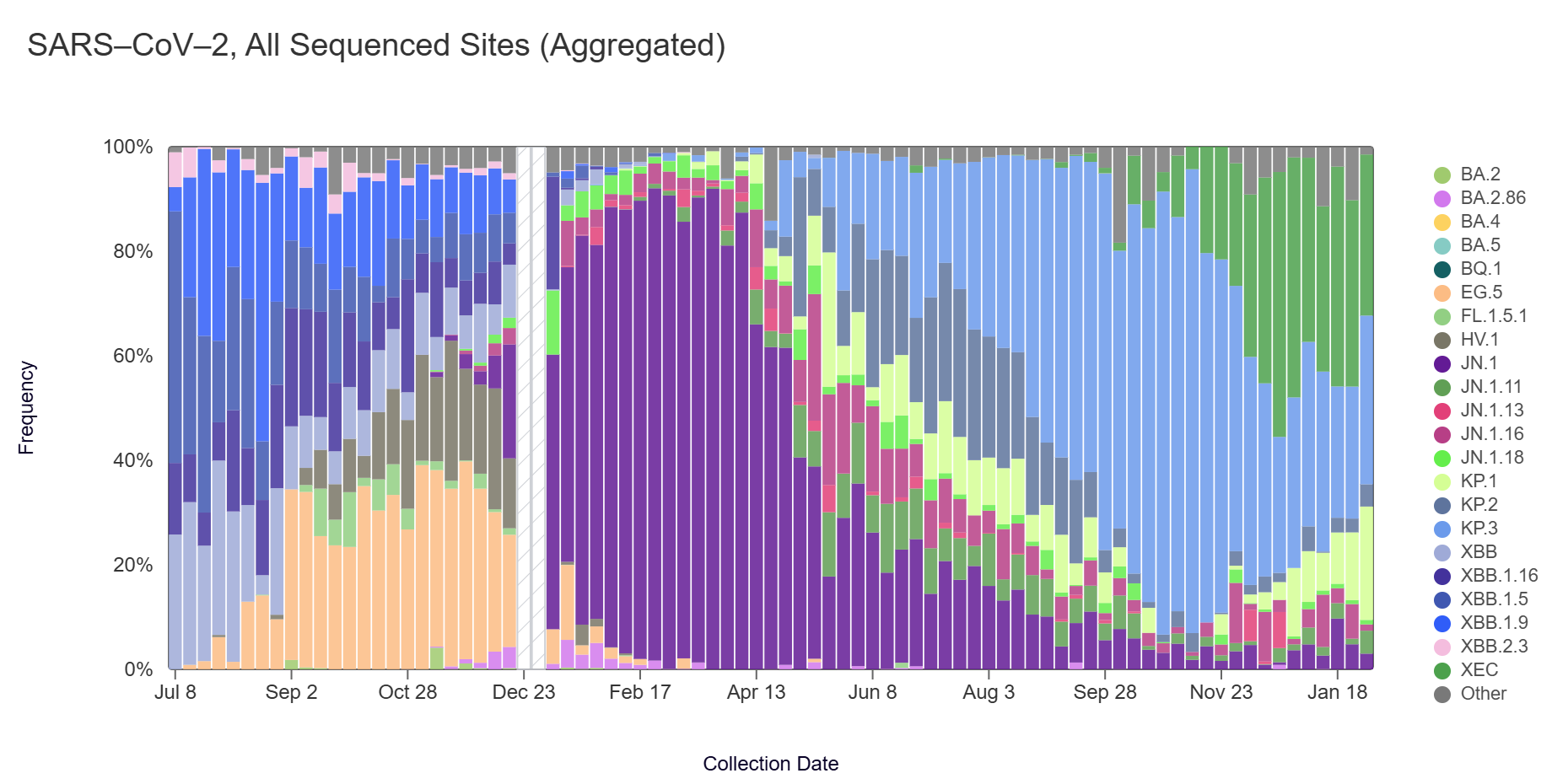 Sequencing data is now also available in aggregate across all sites in WWSCAN with sequencing data through Feb 1. That plot is shown below and suggests that the KP.3 variant (32.3%) and the XEC variant (30.8%) are the most abundant variants.