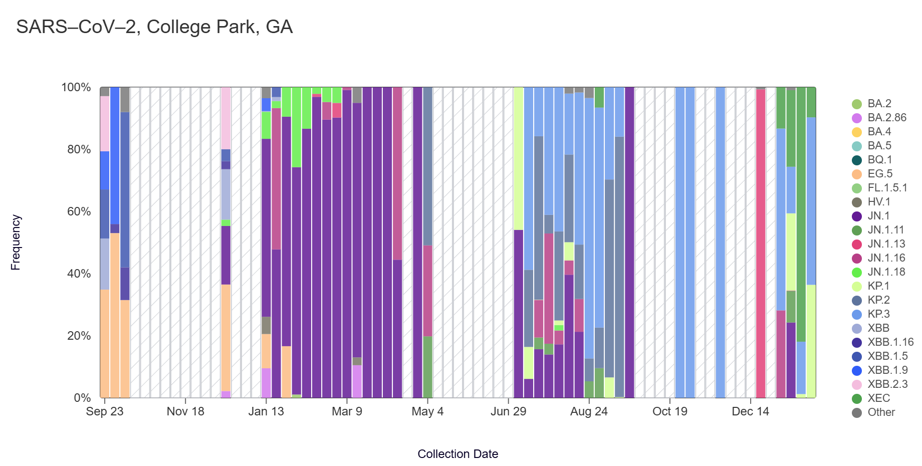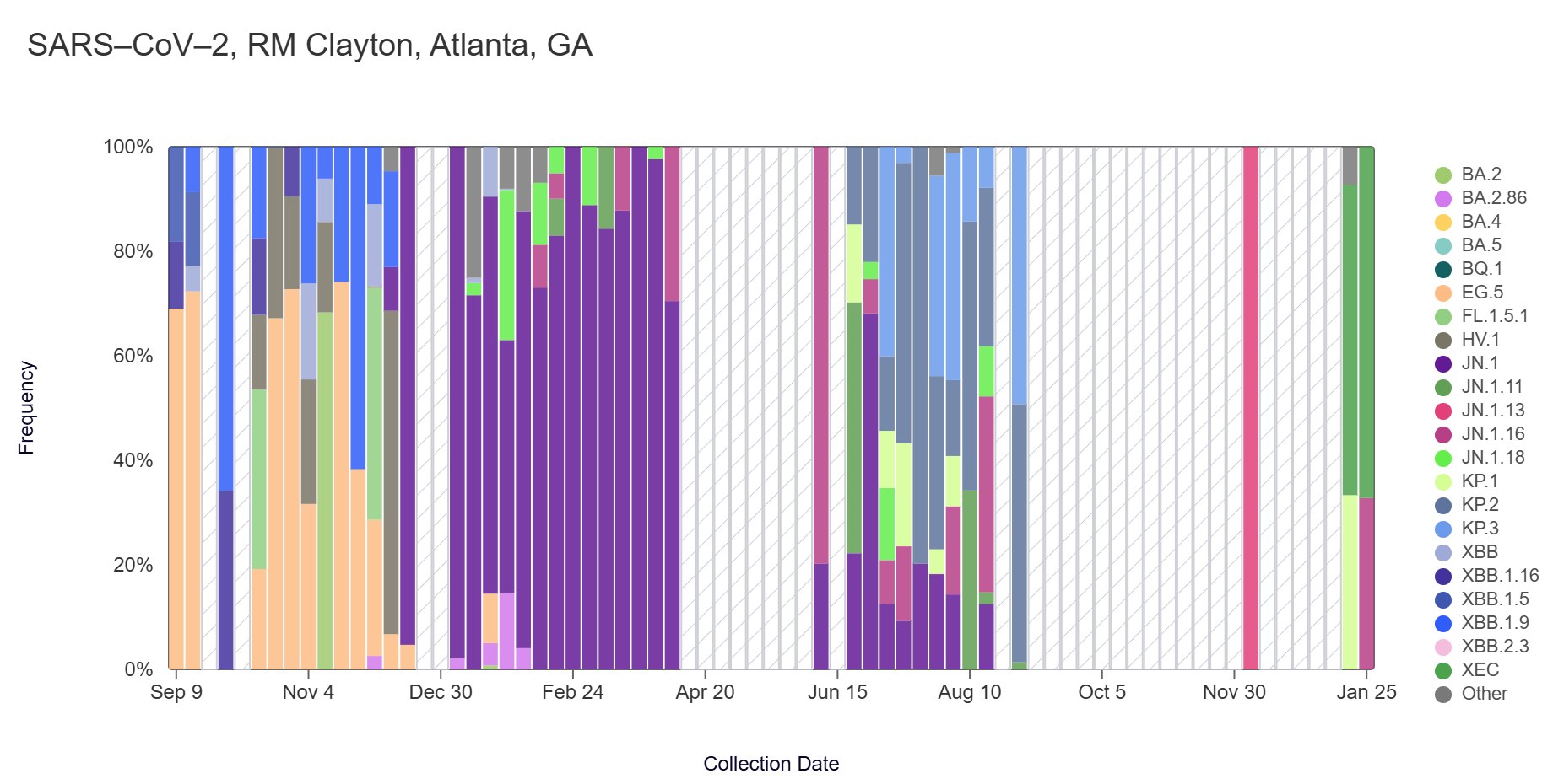 In the most recent samples, the XEC (67.2%) variant made up the largest proportion of lineages detected at RM Clayton. The KP.3 (53.9%) variant made up the largest proportion of lineages detected at College Park. Note that the most recent data is shown below & should be updated as more samples are analyzed (through Jan 25 at RM Clayton and Jan 25 at College Park).