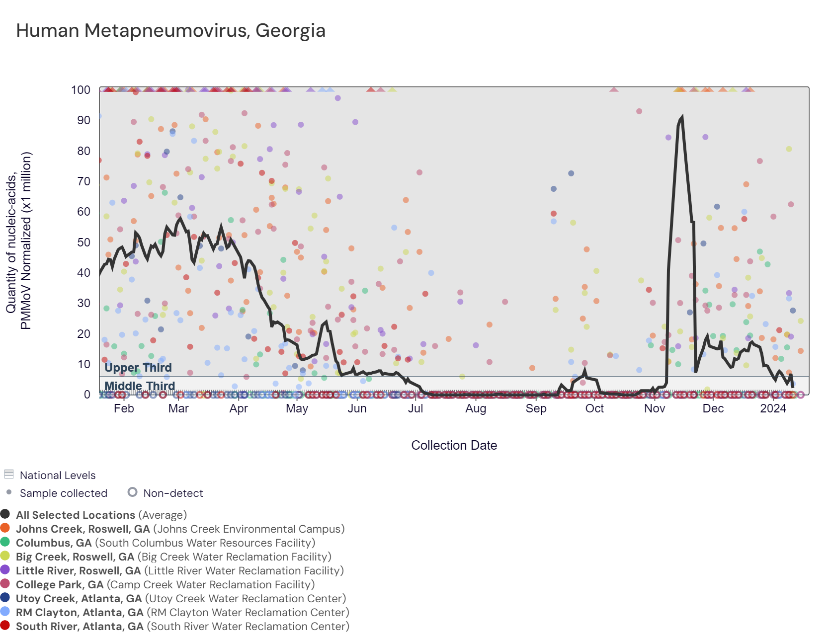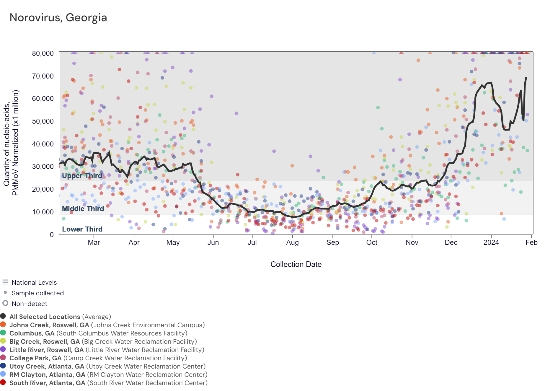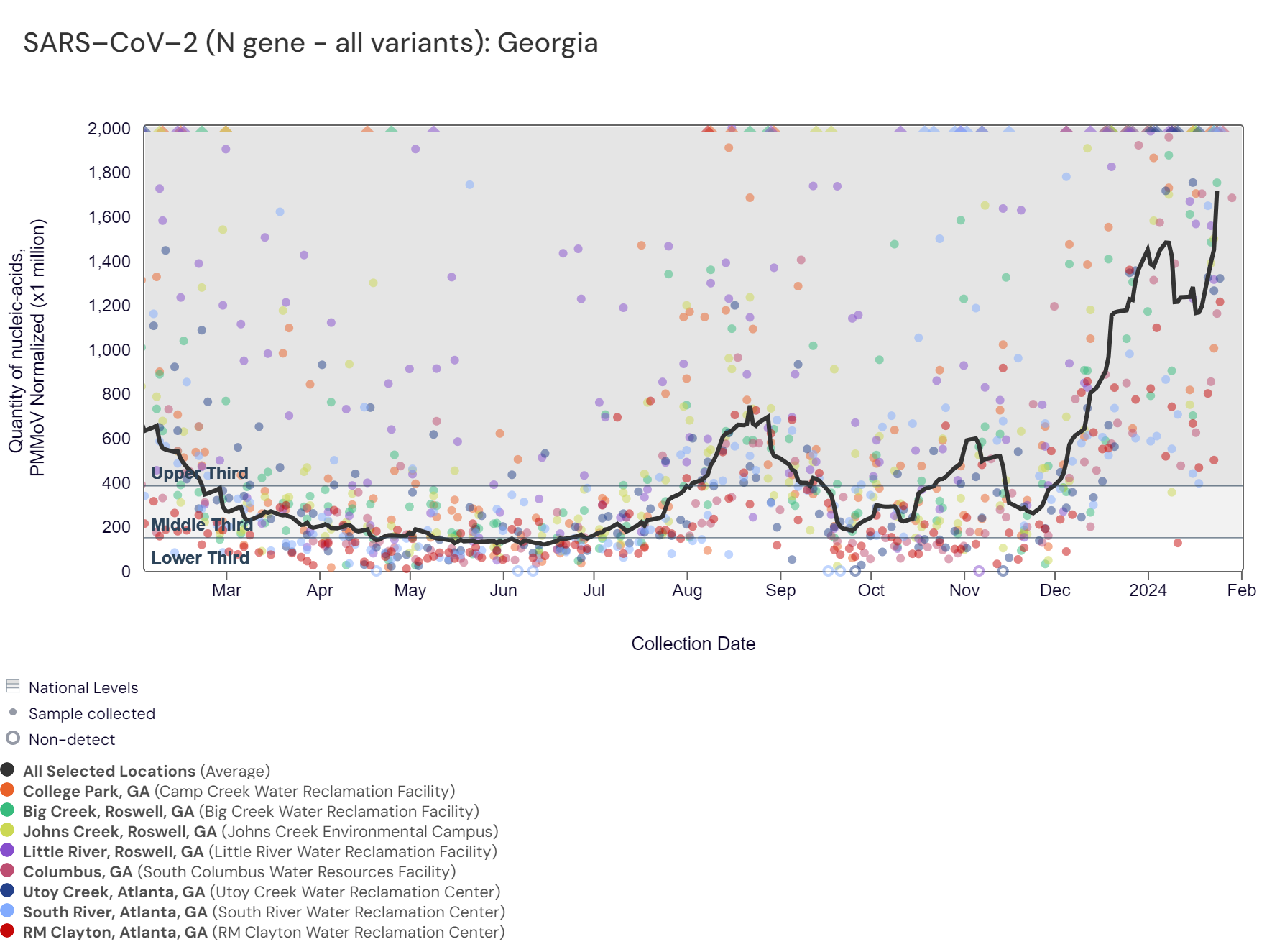 SARS-CoV-2 RNA concentrations have been between 140,000 and 760,000 copies/gram in the last two weeks. The chart below shows the raw data over the last 365 days and the population-weighted aggregated trend line for all 8 Georgia sites when the data is normalized by PMMoV. The aggregated line and the National Levels benchmarks illustrate that SARS-CoV-2 N gene RNA concentrations among Georgia sites are within the upper third level of all concentrations measured in the last year.