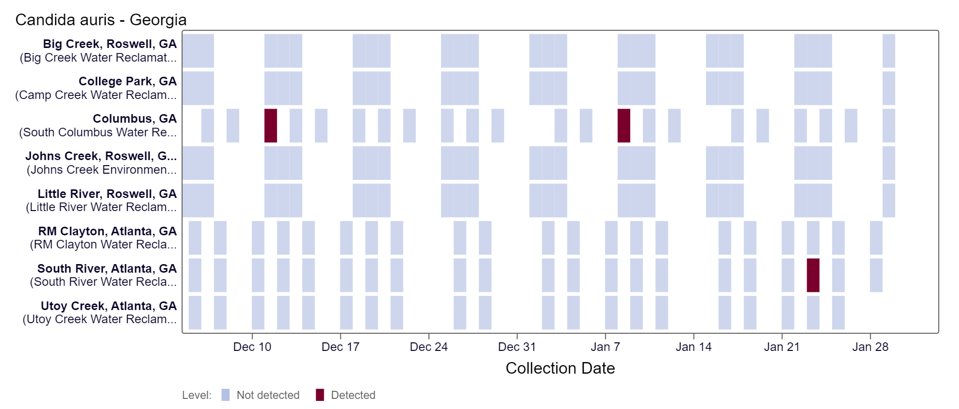 Candida auris DNA has only been detected at the South River site in the last two weeks, based on the heat map below. Because this is a new target, there is no category assigned and we are still establishing what an expected baseline amount of detection will be.