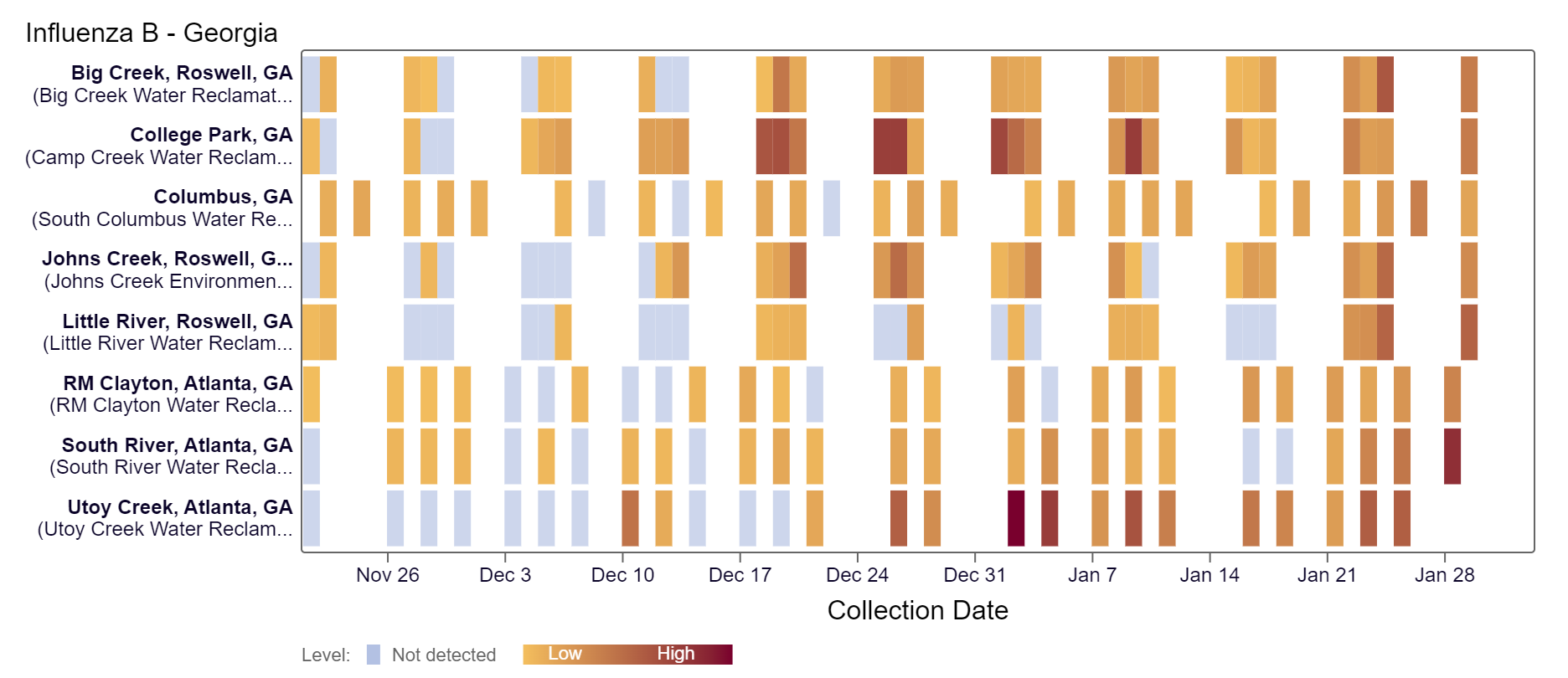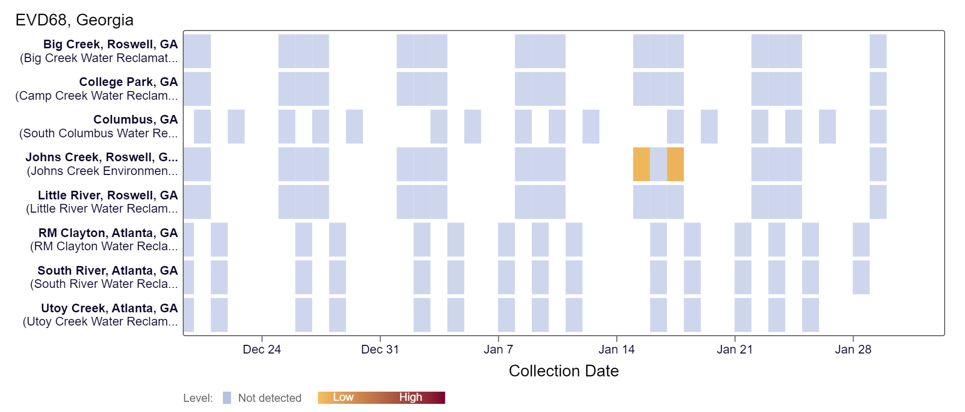 EV-D68 RNA has not been detected at any Georgia sites within the last two weeks, according to the heat map below. As a reminder, the color blue means the sample was non-detect for EV-D68 RNA and the colors get darker with higher concentrations. Because this is a newer target, there is no category assigned and we are still establishing what an expected baseline amount of detection will be.