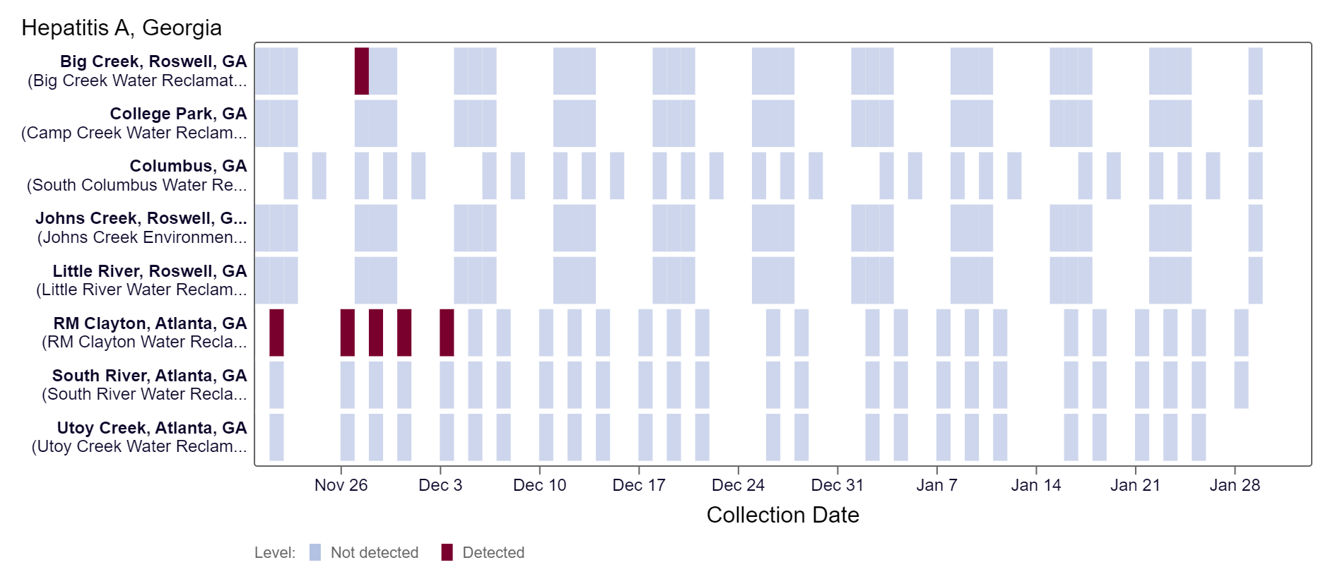 Hepatitis A RNA has not been detected in the last two weeks. Because this is a new target, there is no category assigned and we are still establishing what an expected baseline amount of detection will be.