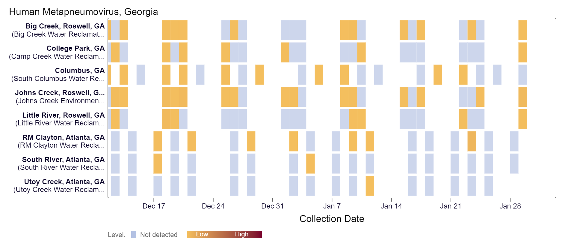 HMPV (human metapneumovirus) RNA concentrations in wastewater are below 12,000 copies/g. Based on the heat map below, HMPV has not been detected at South River or Utoy Creek within the last two weeks. HMPV RNA concentrations in Georgia are much lower in comparison to this time last year. Most Georgia sites are in the LOW (7 sites) Wastewater Category, as of 2/2/24. There was not enough data to calculate a category for Utoy Creek.