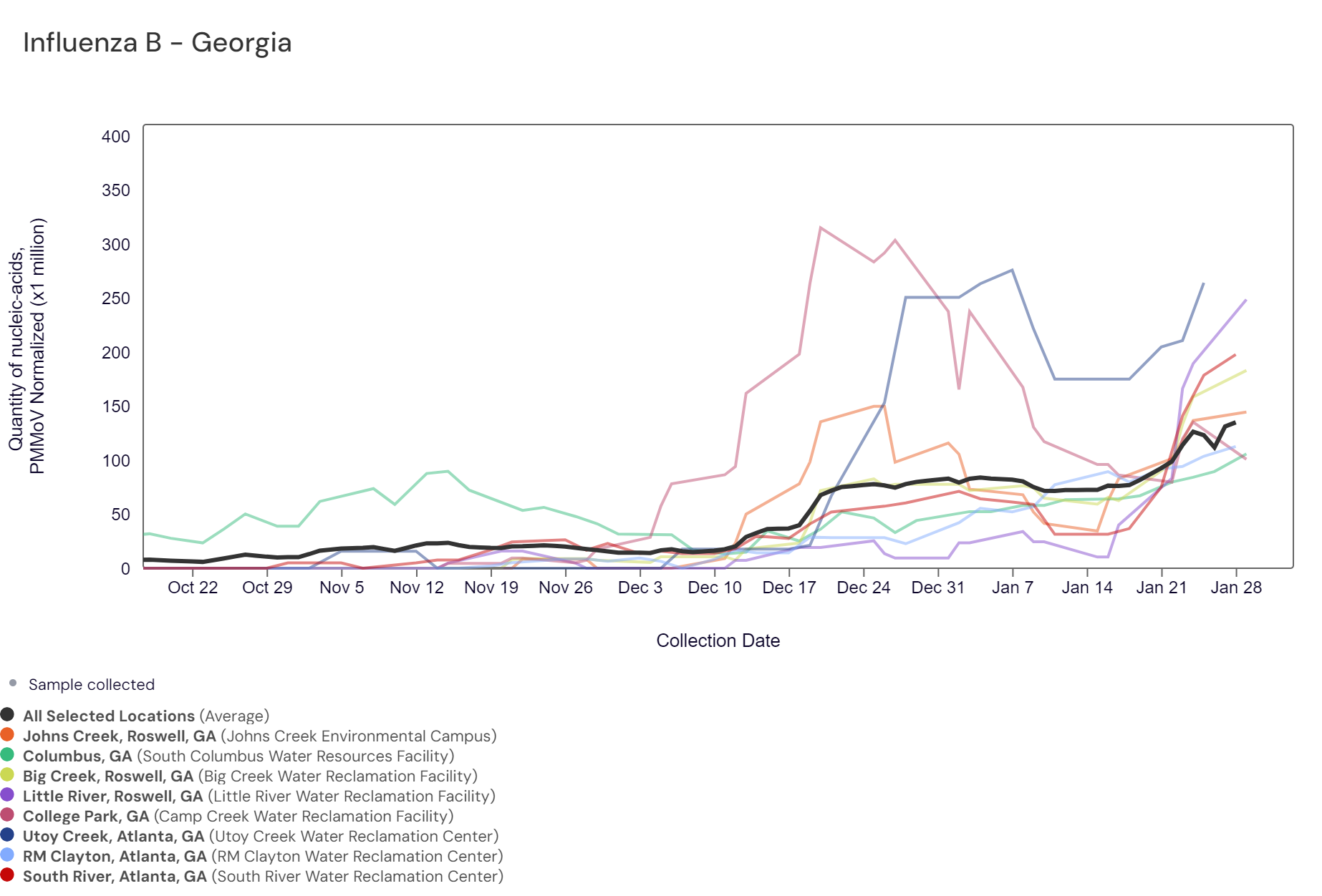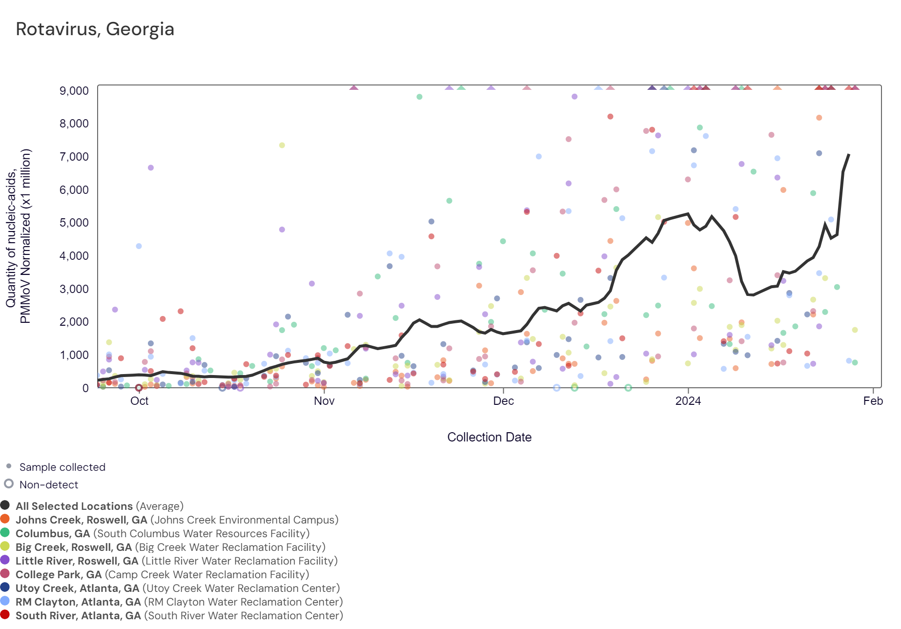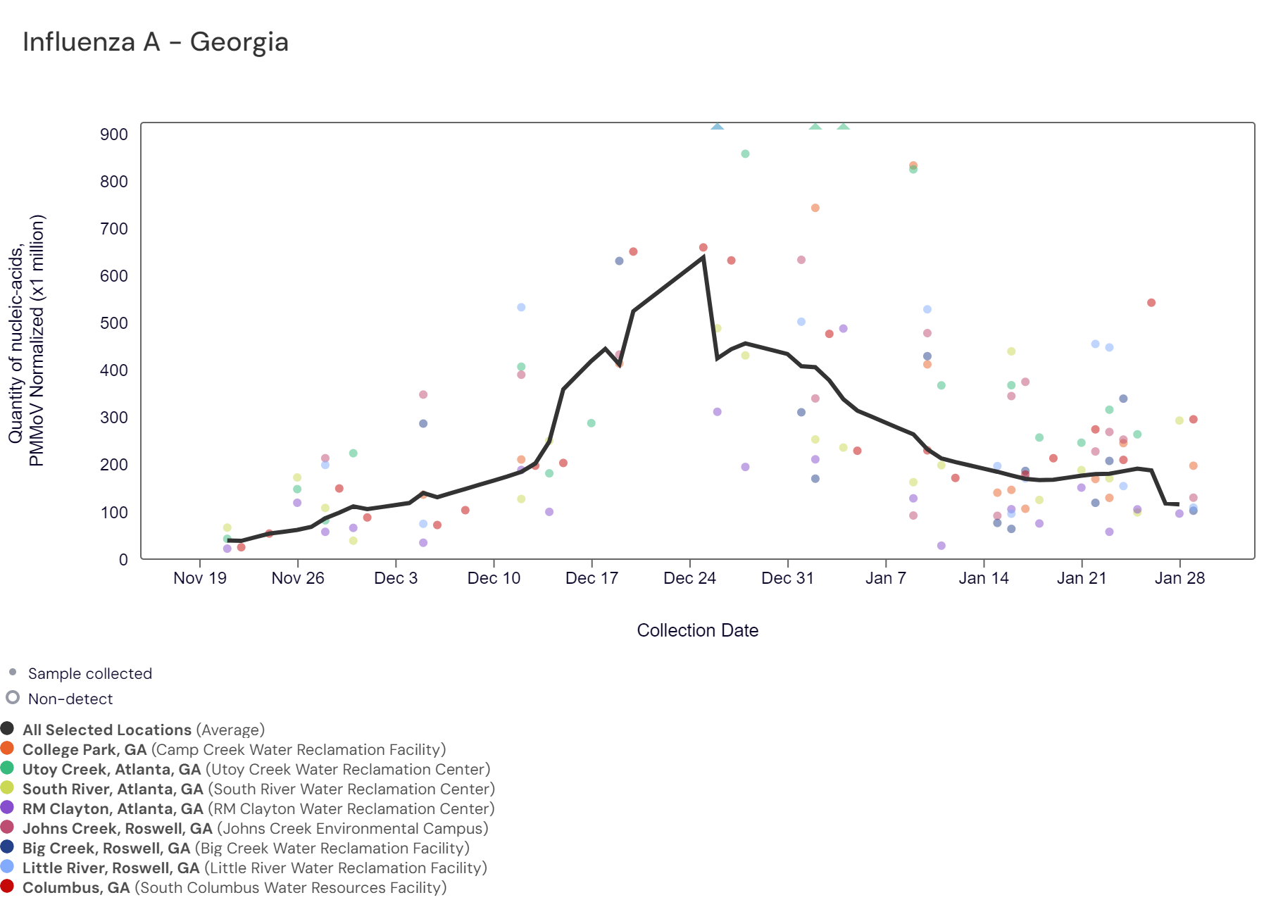 Influenza A: Retrospective data (1 Oct 2023 to approximately 11 Jan 2024) are actively being uploaded to the website as samples get reanalyzed. We expect the entire time series to be filled in by early next week, and as more data becomes available on the website, trends will become clearer. IAV RNA concentrations have been between 20,000 and 98,000 copies/gram in the last two weeks. The chart below shows the raw data from November 21st, 2023, and the population-weighted aggregated trend line for all 8 Georgia sites when the data is normalized by PMMoV. With this data now available, it appears that influenza A peaked in wastewater in the end of December/beginning of January in Georgia.