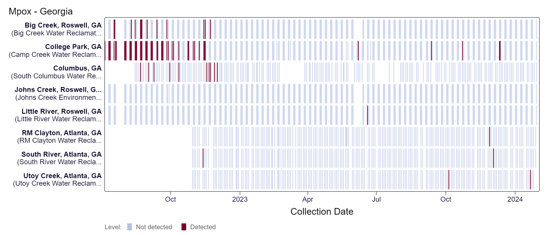 Mpox DNA results have been non-detect at most Georgia sites in the last 21 days except for a single detection on 1/21/24 at Utoy Creek. This heat map shows data since July 2022. Sites are labeled in the rows and each date a sample was collected as a column. The color blue means the sample was non-detect for mpox DNA and the color maroon means Mpox DNA was detected. White indicates no sample was collected. There are 7 Georgia sites in the LOW Wastewater Category as of 2/2/24.