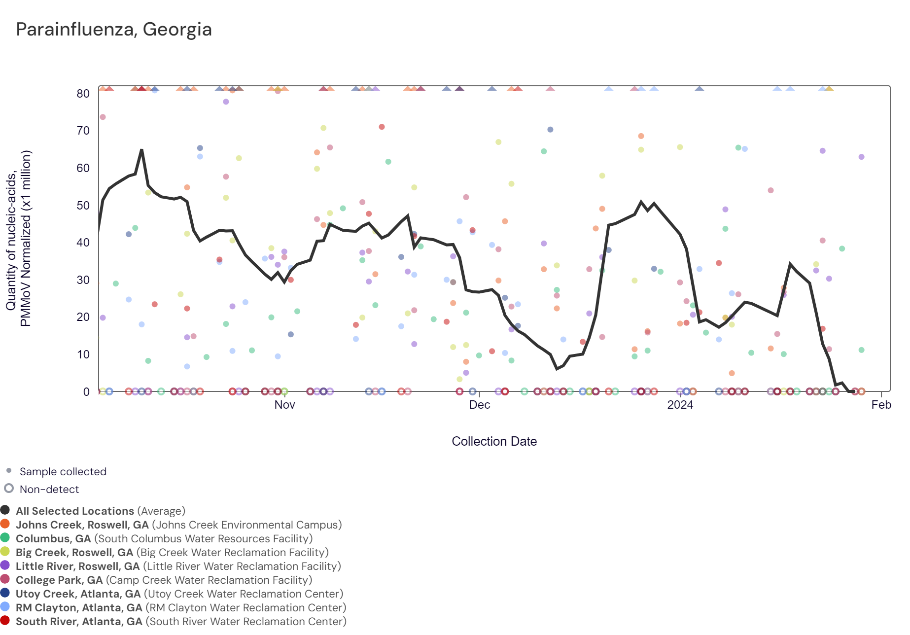 Parainfluenza RNA has been frequently detected at lower concentrations in samples collected from most Georgia sites. Utoy Creek has not detected parainfluenza RNA in the last two weeks. Concentrations have been less than 60,000 copies/g. The chart below shows the raw data and the population-weighted aggregated trend line for all 8 Georgia sites when the data is normalized by PMMoV. Because this is a newer target, there is no category assigned and we are still establishing what an expected baseline amount of detection will be.