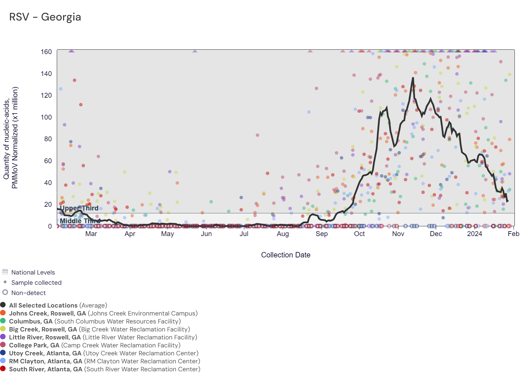 Respiratory syncytial virus (RSV) RNA concentrations were below 25,000 copies/gram over the last two weeks. The chart below includes the raw data for each site since February 2023. The aggregated line and the National Levels benchmarks illustrate that RSV RNA concentrations among Georgia sites are within the upper third level of all concentrations measured in the last year but have come down rgom a peak in December. RM Clayton, College Park, Columbus, Little River, Big Creek, and Johns Creek are in the HIGH (6 sites) Wastewater Category as of 2/2/24. South River is in the LOW (1 site) category. There was not enough data to calculate a category for Utoy Creek.