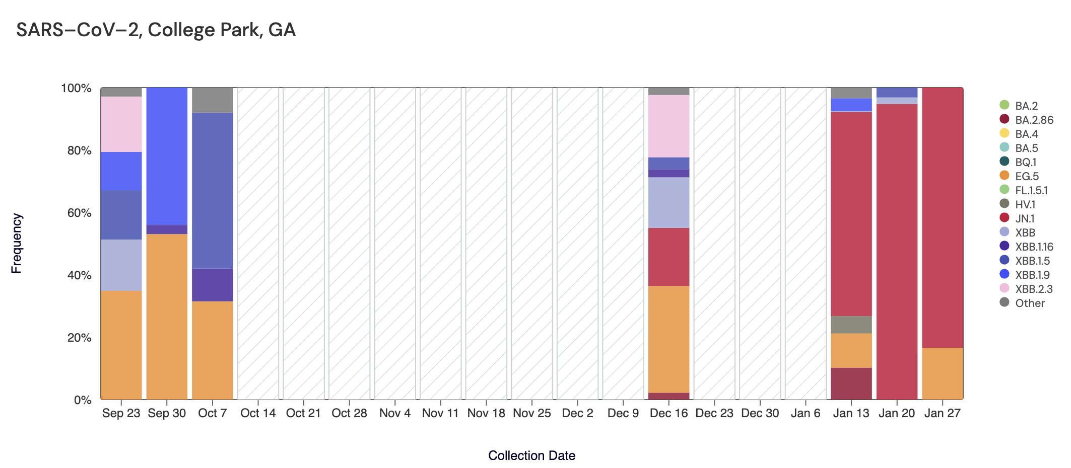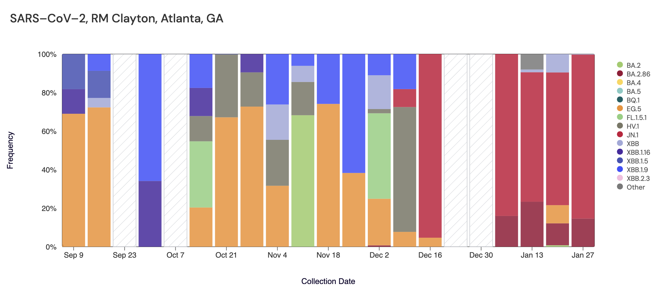 In the most recent samples, JN.1 (bright red) made up the largest proportion of the lineages detected at both sites (83.4% at College Park, and 85.1% at RM Clayton). Note that the sequencing data are always from samples taken between 1- 2 weeks ago. The most recent data are from last week (through Jan 27).