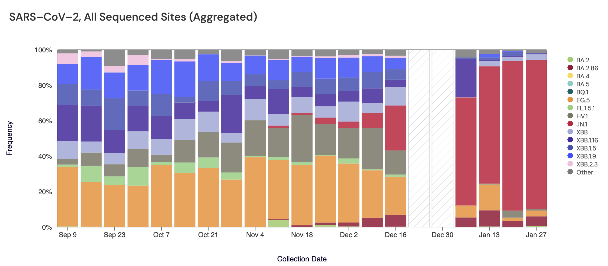 Sequencing data is now also available in aggregate across all sites in WWSCAN with sequencing data. That plot is shown below, and also suggest that JN.1 is the most abundant variant across all sites.
