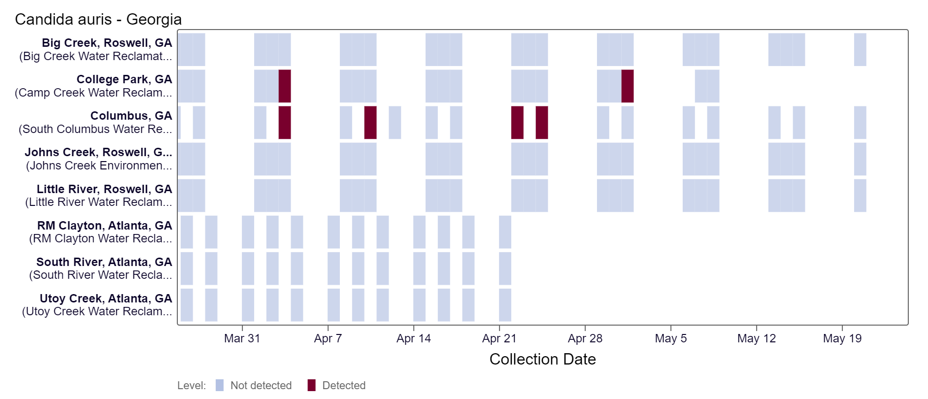 Candida auris DNA has not been detected at these Georgia sites in the last two weeks, based on the heat map below. As of 5/24/24, all of the Roswell sites & the Columbus site are in the LOW (4 sites) wastewater category. There was not enough data to calculate a category for College Park, Utoy Creek, South River, and RM Clayton.