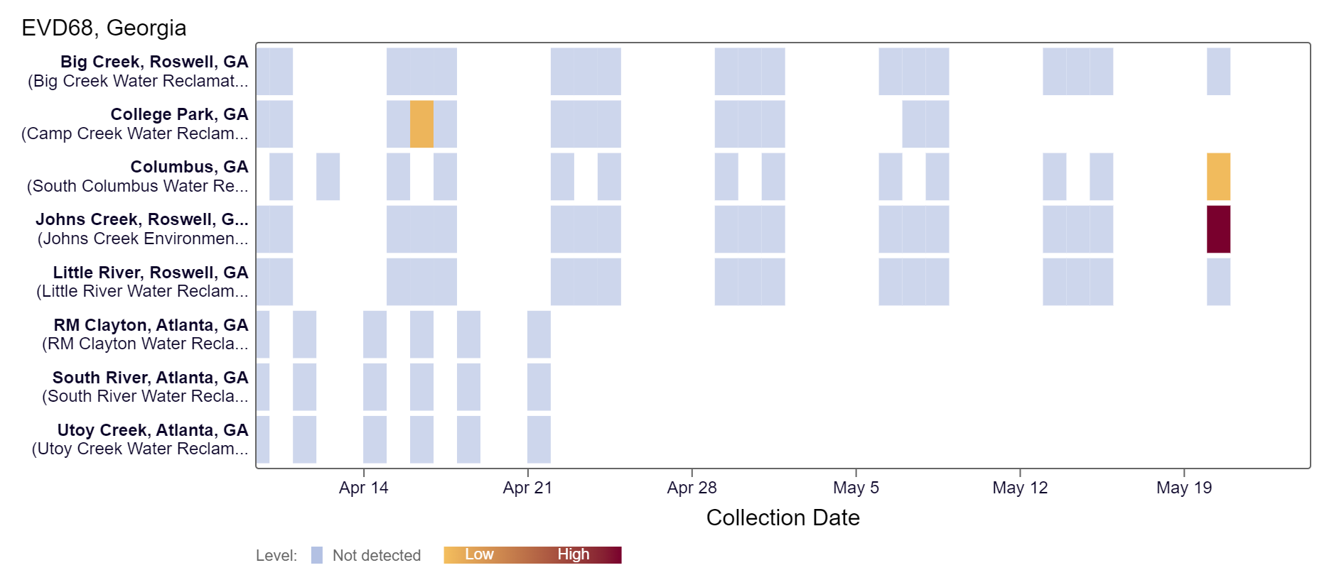 EV-D68 RNA has been detected at the Columbus and Johns Creek sites over the last couple weeks, according to the heat map below. As a reminder, the color blue means the sample was non-detect for EV-D68 RNA and the colors get darker with higher concentrations. As of 5/24/24, all of the Roswell sites & Columbus are in the LOW (4 sites) wastewater category. There was not enough data to calculate a category for College Park, Utoy Creek, South River, and RM Clayton.