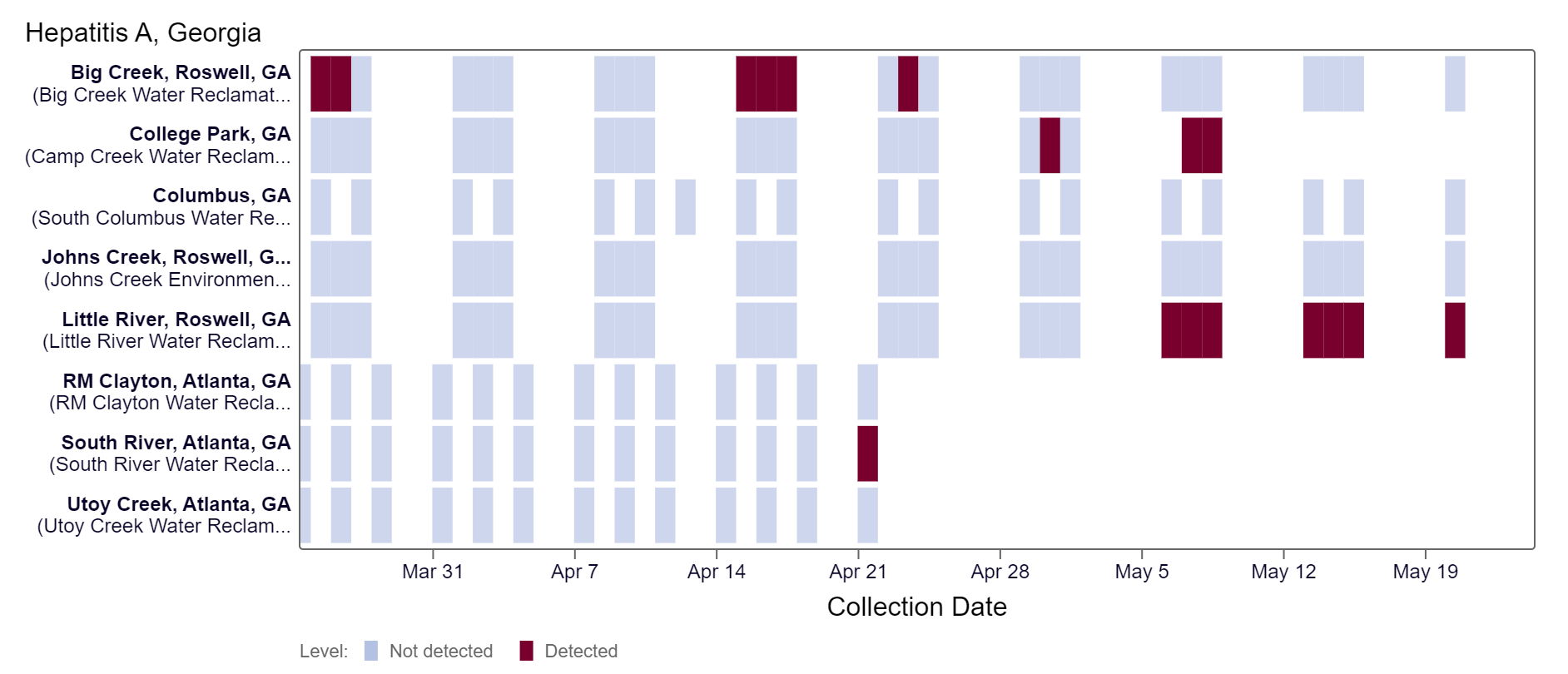 Hepatitis A RNA has been detected at Little River over the last two weeks, according to the heat map. As of 5/24/24, Little River is in the MEDIUM (1 site) wastewater category while Big Creek, Johns Creek, & Columbus site are in the LOW (3 sites) wastewater category. There was not enough data to calculate a category for College Park, Utoy Creek, South River, and RM Clayton.