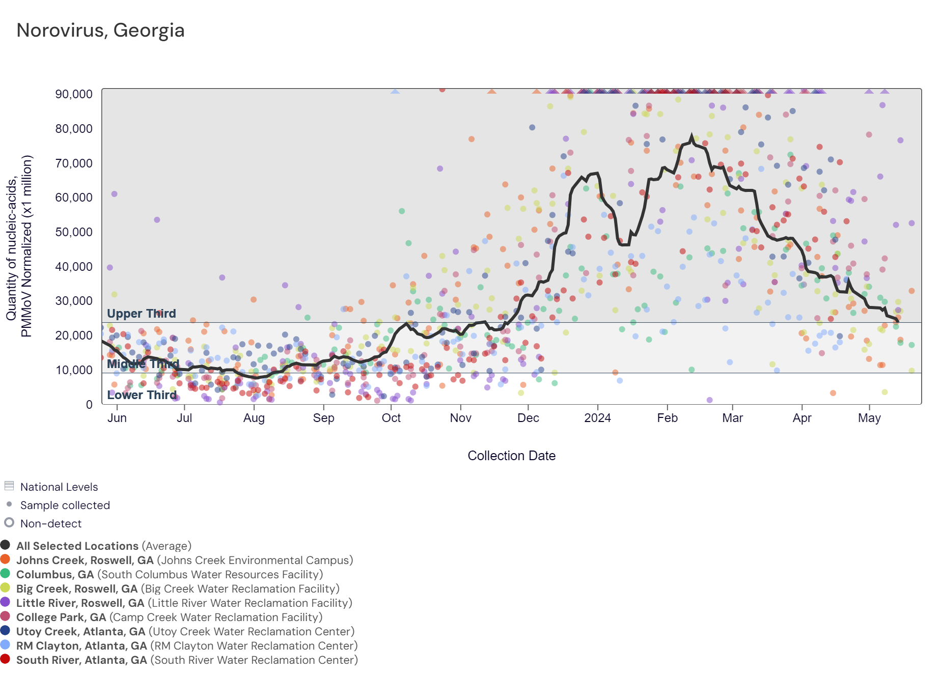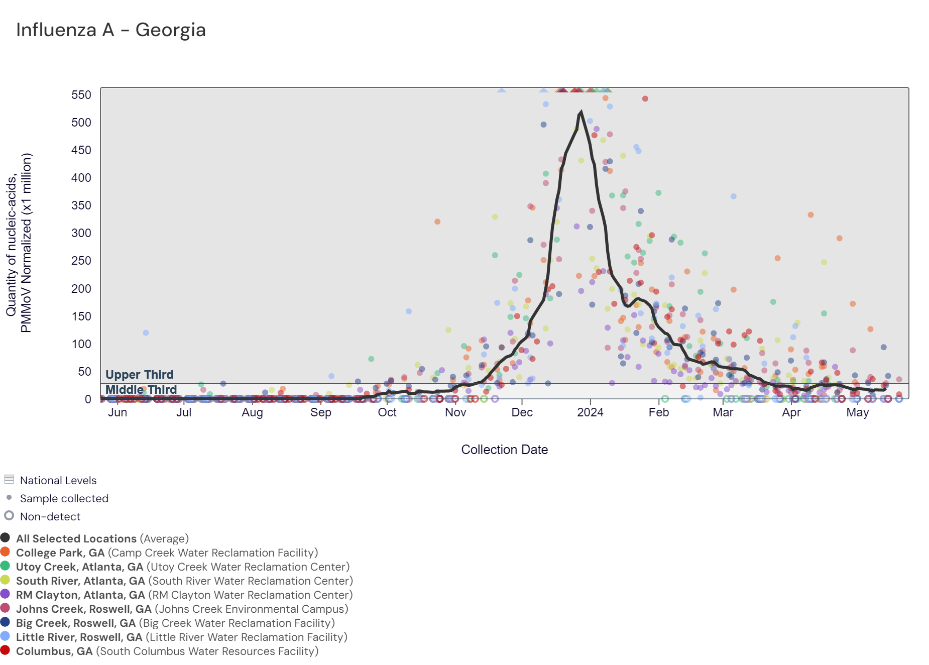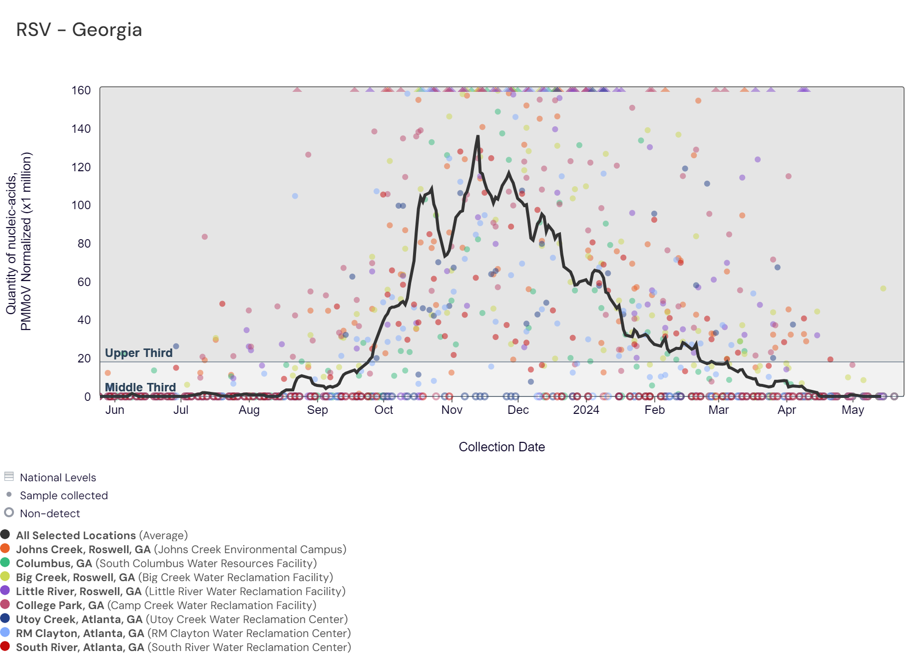 Respiratory syncytial virus (RSV) RNA has been detected at these Georgia sites over the last two weeks. The chart below includes the raw data for each site since 2023. The aggregated line below shows that RSV RNA concentrations among Georgia sites remain at the bottom of the lower third level of all concentrations measured in the last year.