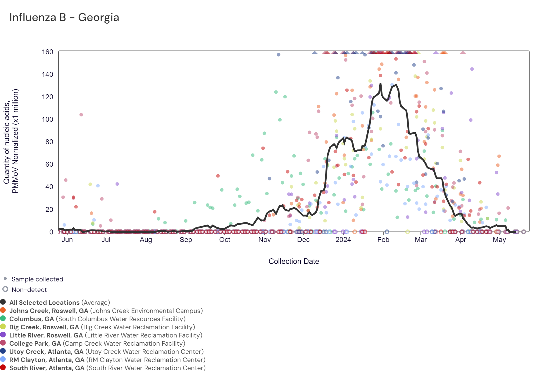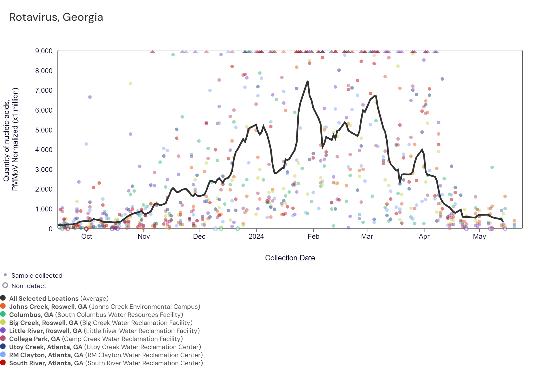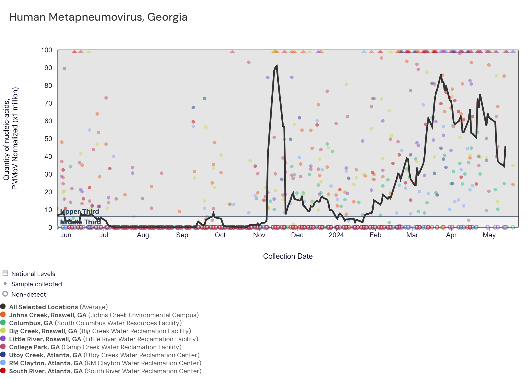 Respiratory syncytial virus (RSV) RNA has been detected at these Georgia sites over the last two weeks. The chart below includes the raw data for each site since 2023. The aggregated line below shows that RSV RNA concentrations among Georgia sites remain at the bottom of the lower third level of all concentrations measured in the last year.