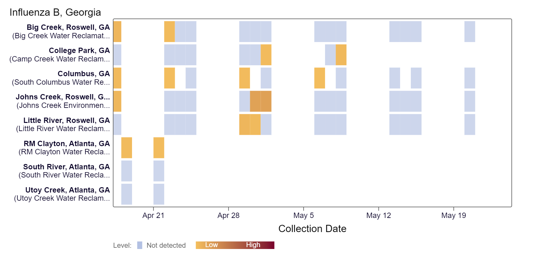 Influenza B (IBV) RNA has not been detected at any Georgia site within the last two weeks, according to the heat map below.
