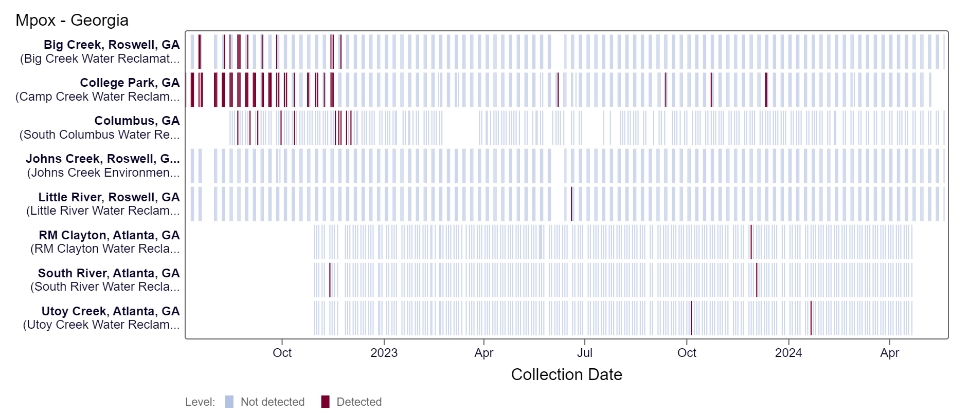 Mpox DNA results have been non-detect at all Georgia sites in the last 21 days. This heat map shows data since July 2022. Sites are labeled in the rows and each date a sample was collected as a column. The color blue means the sample was non-detect for mpox DNA and the color maroon means Mpox DNA was detected. White indicates no sample was collected. All of the Roswell sites & the Columbus site are in the LOW (4 sites) wastewater category as of 5/24/24. There was not enough data to calculate a category for College Park, Utoy Creek, South River, and RM Clayton.