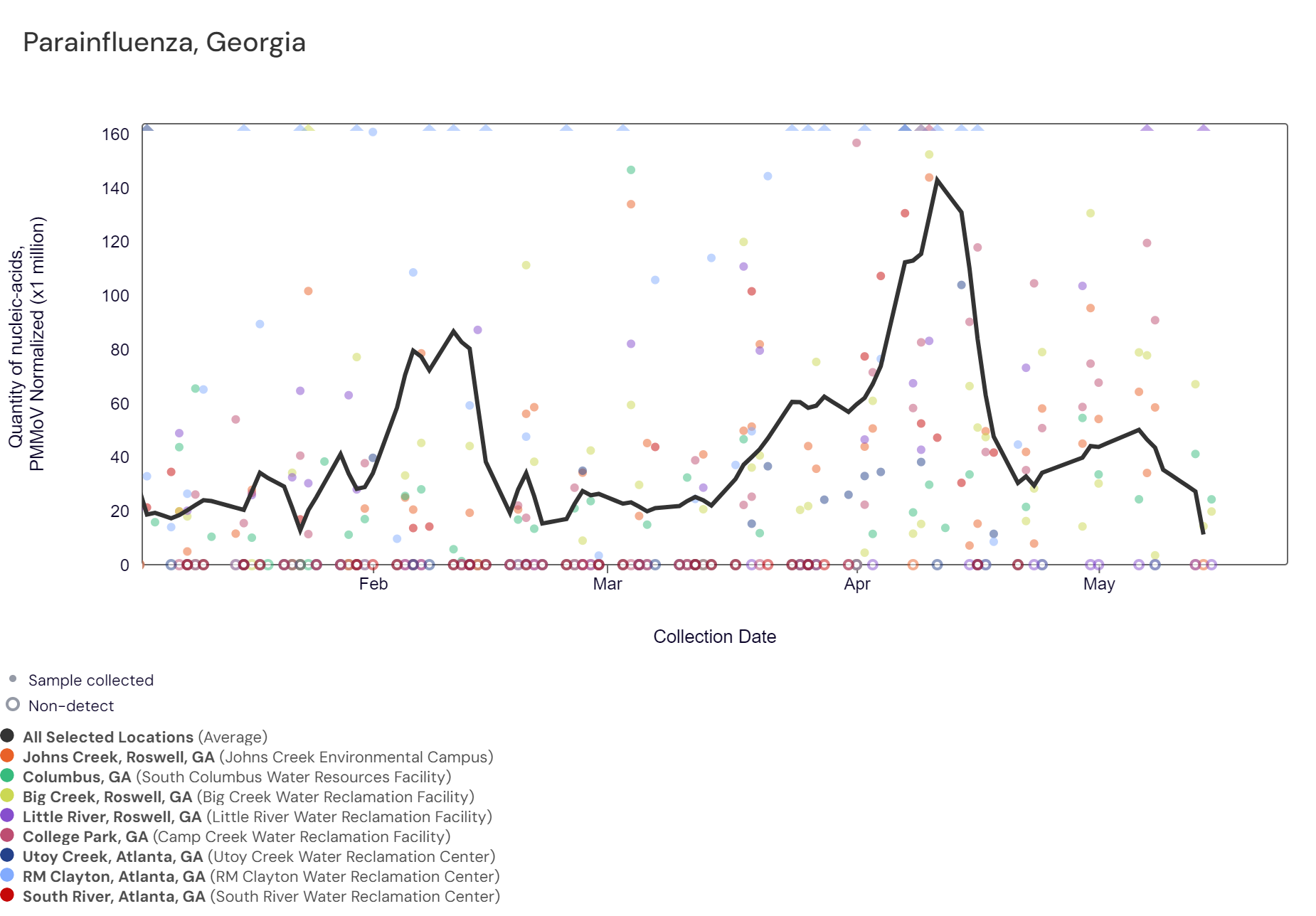 Parainfluenza RNA has not been detected in the wastewater at Georgia sites within the last two weeks. Parainfluenza concentrations have been below 14,000 copies/g. The chart below shows the raw data and the population-weighted aggregated trend line for all 8 Georgia sites when the data is normalized by PMMoV.