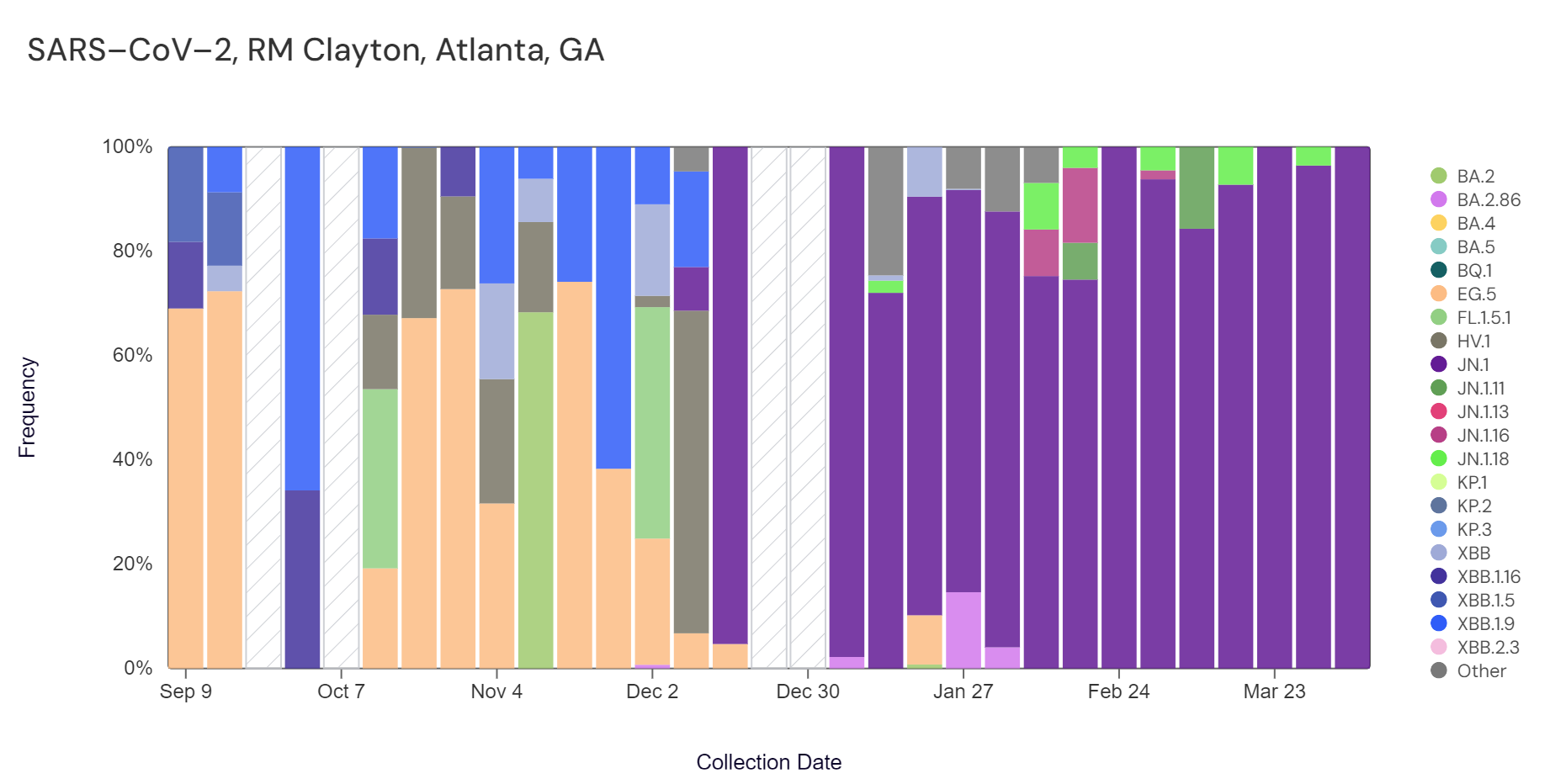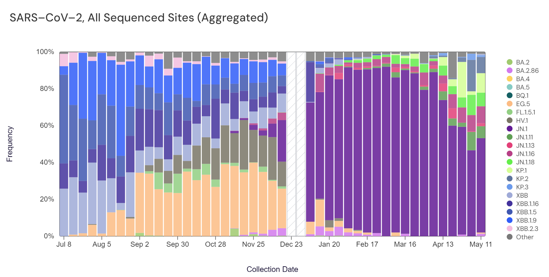Sequencing data is now also available in aggregate across all sites in WWSCAN with sequencing data. That plot is shown below and also suggests that JN.1 is the most abundant variant across all sites (51.2%).