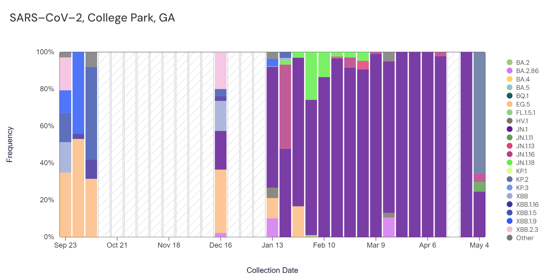 In the most recent samples, JN.1 (dark purple) made up the largest proportion of the lineages detected at RM Clayton (100%), and JN.1 made up 24.6% of the lineages at College Park. KP.2 (65.5%) made up the largest proportion of lineages detected at College Park. Note that the most recent data are from 1-5 weeks ago (through Apr 6 at RM Clayton & May 4 at College Park).
