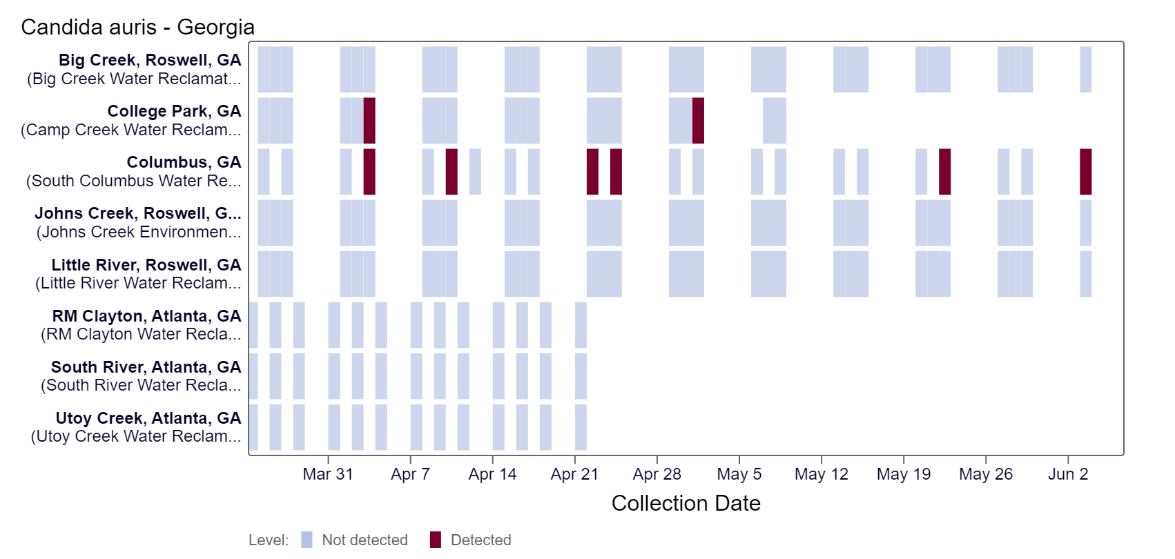 Candida auris DNA has been detected at the Columbus site in the last two weeks, based on the heat map below. As of 6/7/24, all of the Roswell sites & the Columbus site are in the LOW (4 sites) wastewater category. There was not enough data to calculate a category for College Park, Utoy Creek, South River, and RM Clayton.