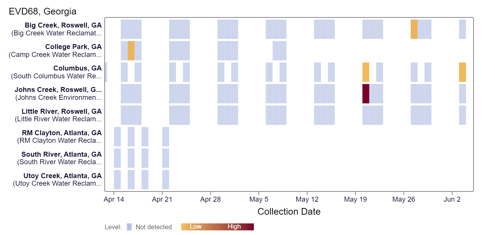 EV-D68 RNA has been detected at the Columbus and Big Creek sites over the last couple weeks, according to the heat map below. As a reminder, the color blue means the sample was non-detect for EV-D68 RNA and the colors get darker with higher concentrations. As of 6/7/24, all of the Roswell sites & Columbus are in the LOW (4 sites) wastewater category. There was not enough data to calculate a category for College Park, Utoy Creek, South River, and RM Clayton.