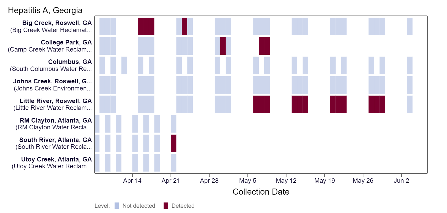 Hepatitis A RNA continues to be detected at the Little River site over the last two weeks, according to the heat map. As of 6/7/24, Little River is in the MEDIUM (1 site) wastewater category while Big Creek, Johns Creek, & Columbus are in the LOW (3 sites) wastewater category. There was not enough data to calculate a category for College Park, Utoy Creek, South River, and RM Clayton.