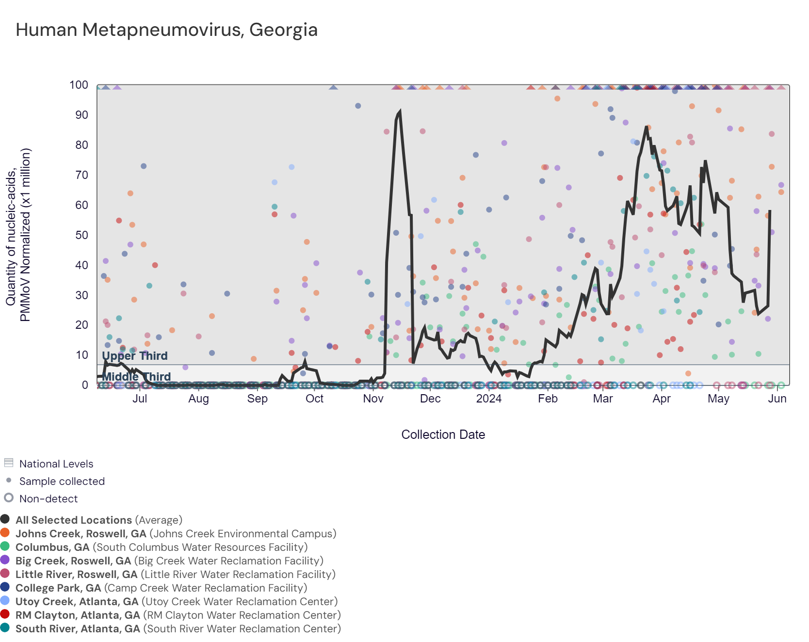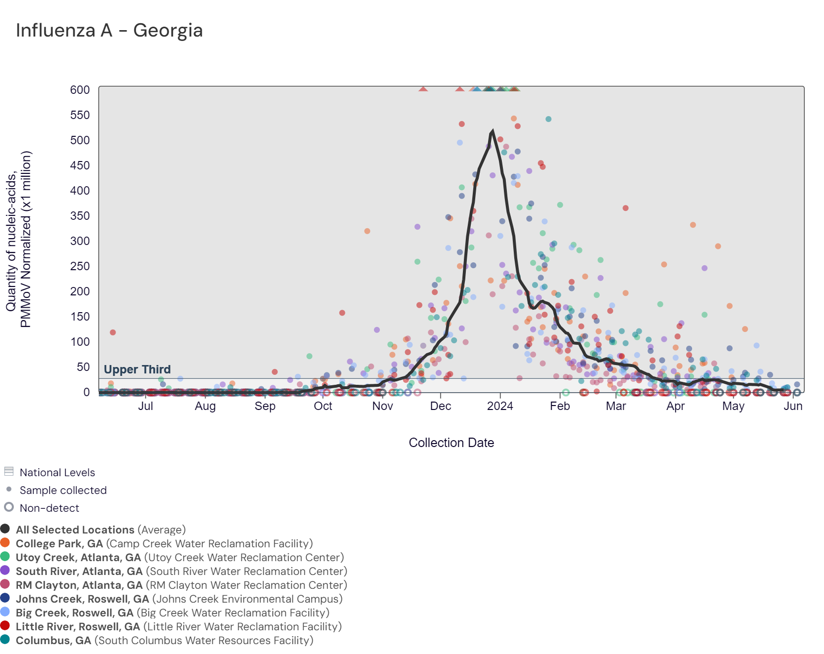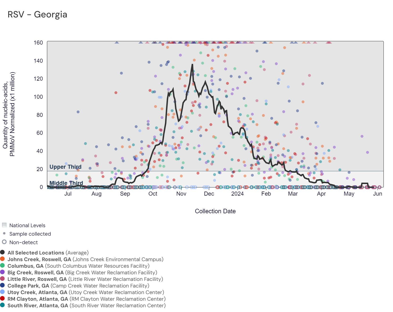 Respiratory syncytial virus (RSV) RNA has not been detected at these Georgia sites over the last two weeks. The chart below includes the raw data for each site since 2023. The aggregated line below shows that RSV RNA concentrations among Georgia sites are near the bottom of the middle third level of all concentrations measured in the last year. Nationally, RSV is not in onset.