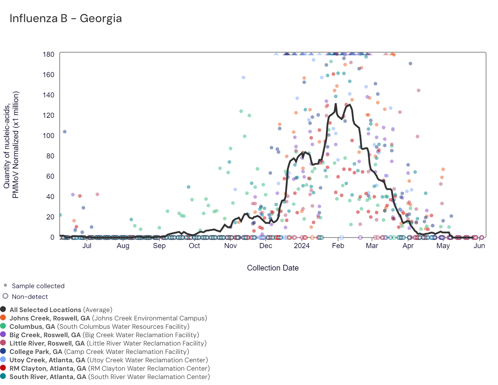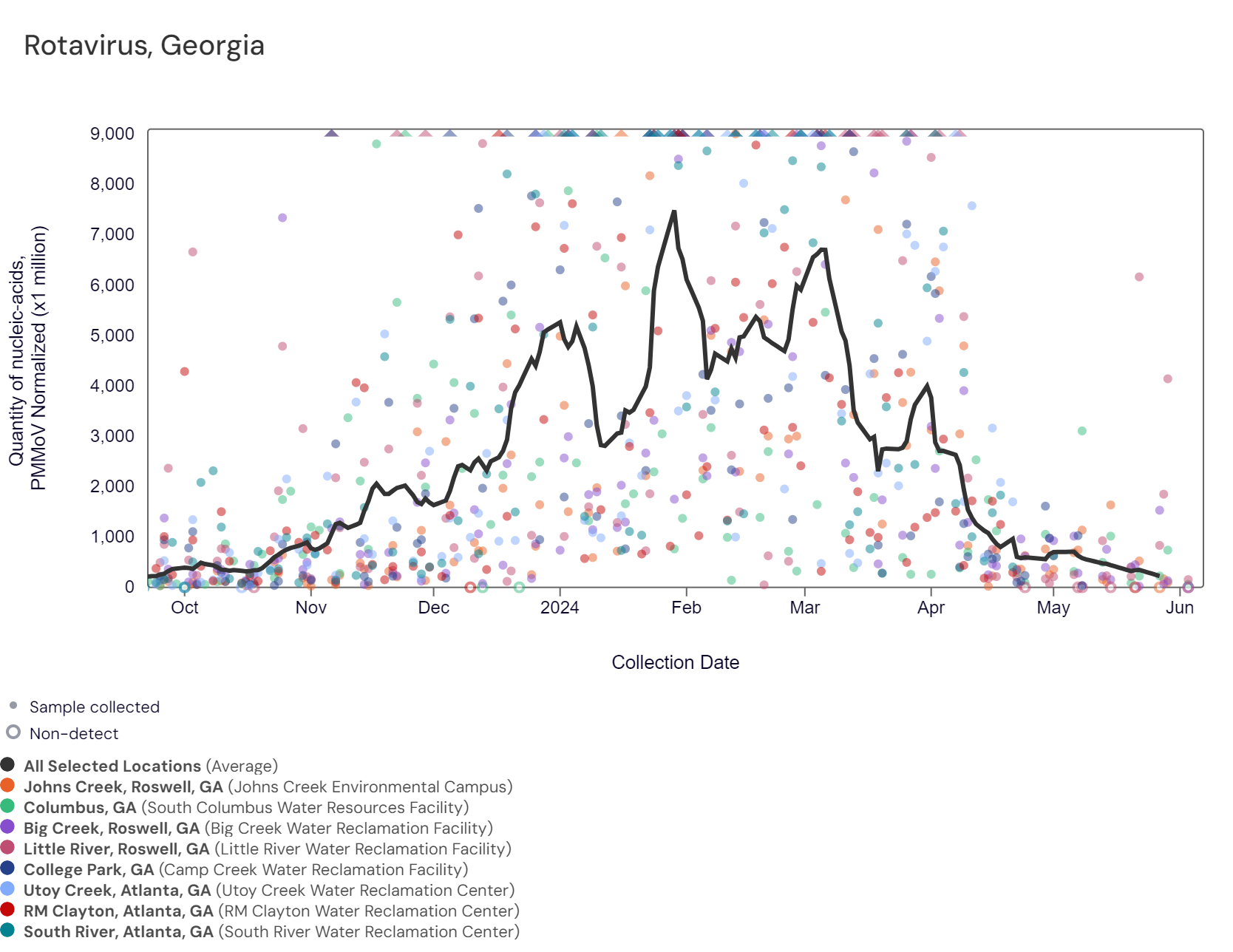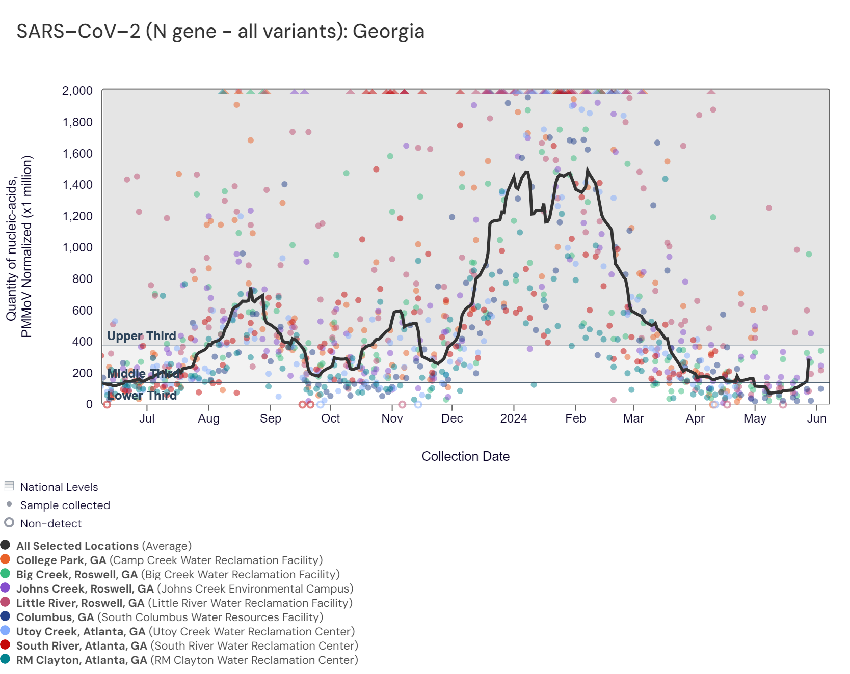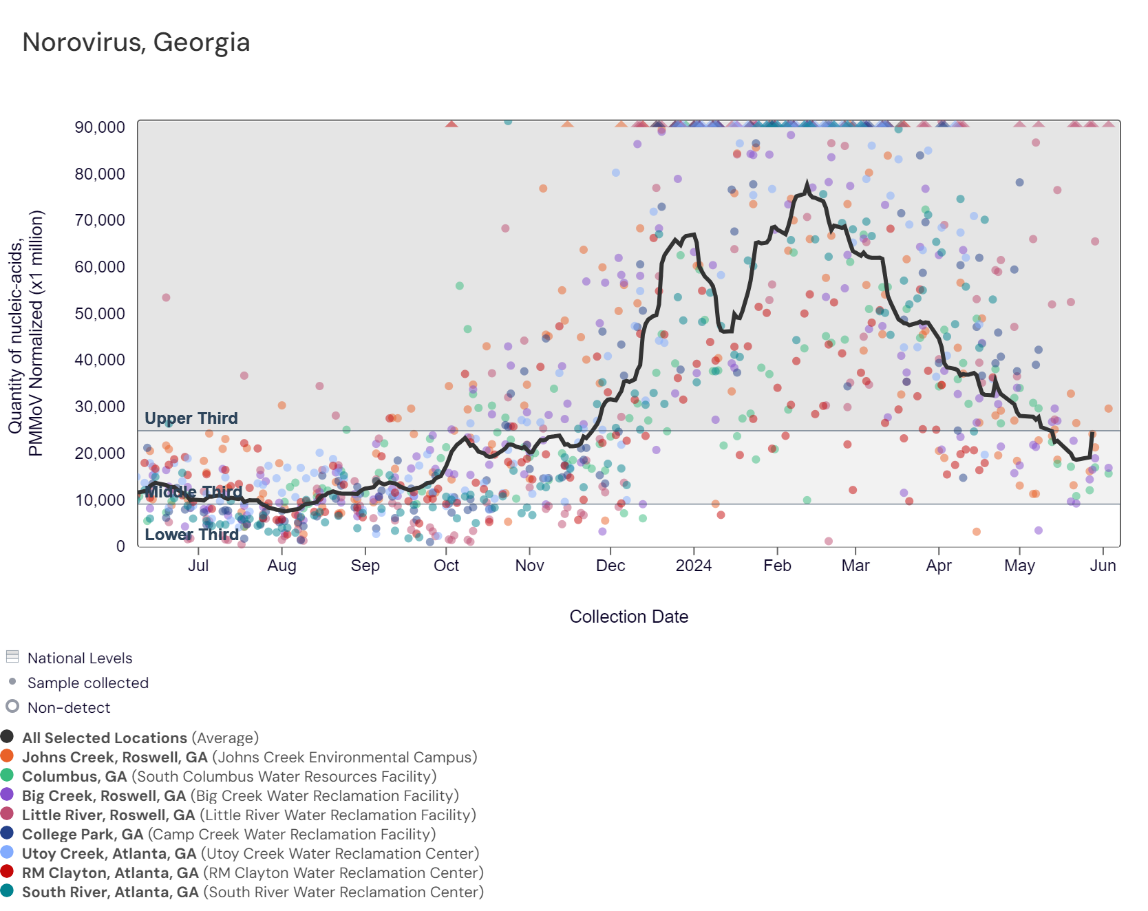 Respiratory syncytial virus (RSV) RNA has not been detected at these Georgia sites over the last two weeks. The chart below includes the raw data for each site since 2023. The aggregated line below shows that RSV RNA concentrations among Georgia sites are near the bottom of the middle third level of all concentrations measured in the last year. Nationally, RSV is not in onset.