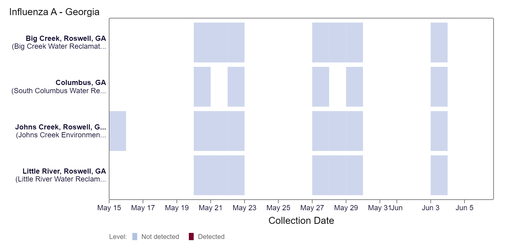 A couple of weeks ago beginning May 21st, we expanded prospective H5 marker testing to all WastewaterSCAN sites. Below is a heat map showing the Georgia sites with samples collected since May 15th. Over the last few weeks, results have been non-detect at all Georgia sites with data available. For more information about this testing and interpretation of results, see our FAQ sheet here.